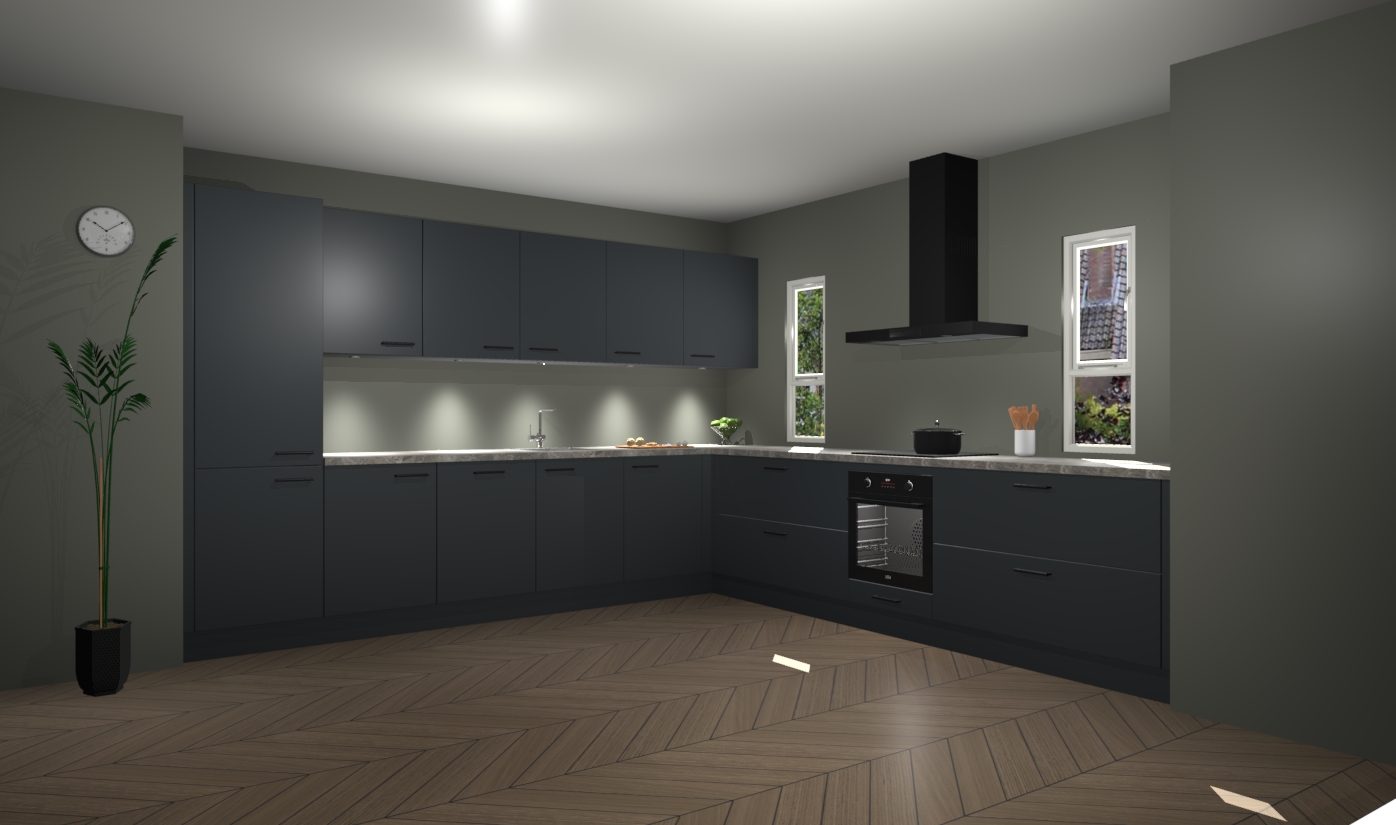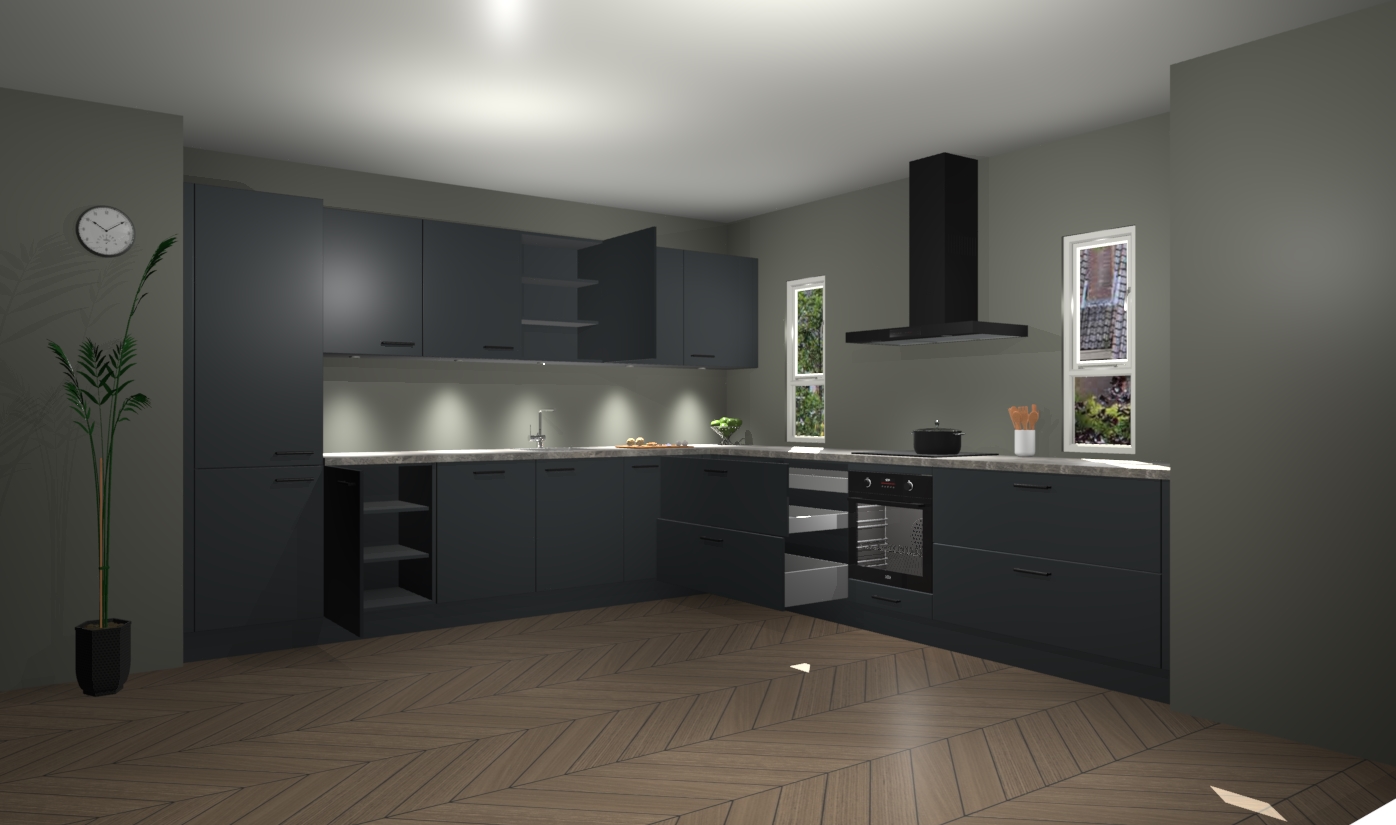 De onyxgrijze keuken is een ideale hoekkeuken en heeft alle functies en apparatuur die u maar nodig kunt hebben. Bij de bestelling krijgt u een oven, inductiekookplaat, afzuigkap, vaatwasser en koelkast - deze kunnen desgewenst eenvoudig worden uitgebreid naar AEG na bestellen. Elke kast wordt ook voor gemonteerd geleverd met soft close deuren die jarenlang gebruik beloven. Stelt u zich voor dat u geen gedoe heeft met vervelende montage - vanaf het moment dat u uw bestelling plaats, duurt het slechts 7 weken voor het bij u thuis geleverd wordt.