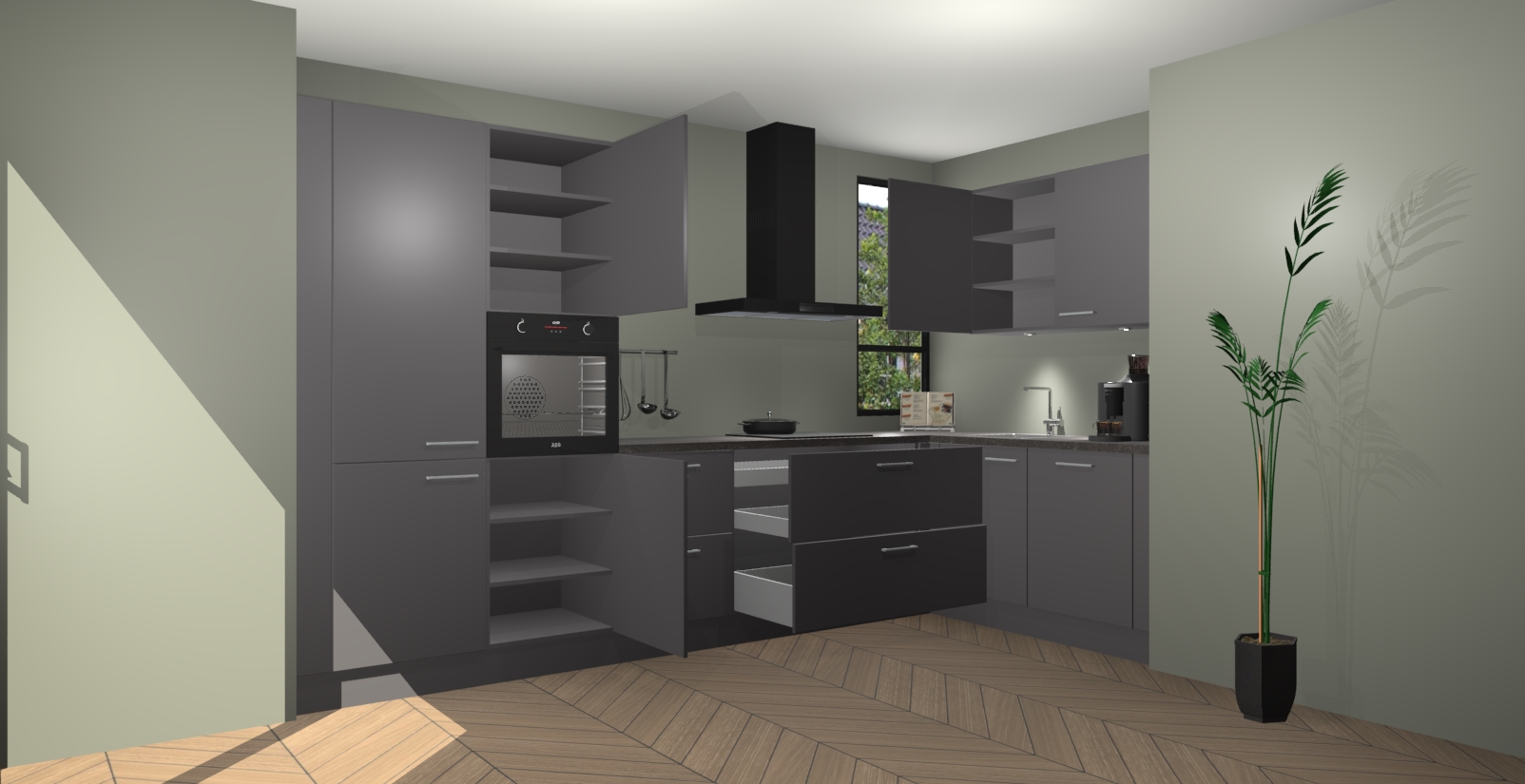 Welkom in uw nieuwe moderne keuken! Laat ons u voorstellen aan de Onyxgrijze keuken Vlaanderen . Deze prachtige hoekkeuken straalt exclusiviteit en luxe uit als geen ander. Het strakke design, de tijdloze kleuren en het model maken van deze keuken een moderne klassieker. En met voldoende opbergruimte heeft deze keuken echt voor ieder wat wils.