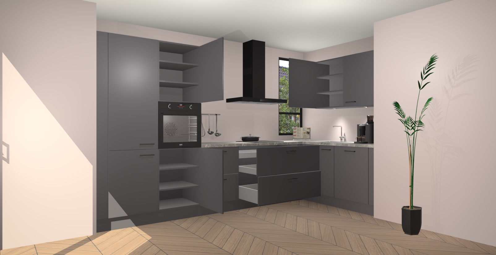 Welkom in uw nieuwe moderne keuken! Laat ons u voorstellen aan de Onyxgrijze keuken Vlaanderen . Deze prachtige hoekkeuken straalt exclusiviteit en luxe uit als geen ander. Het strakke design, de tijdloze kleuren en het model maken van deze keuken een moderne klassieker. En met voldoende opbergruimte heeft deze keuken echt voor ieder wat wils.