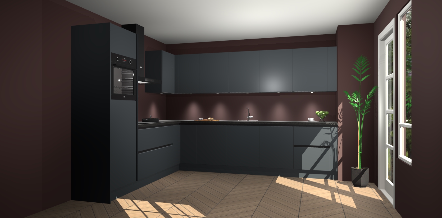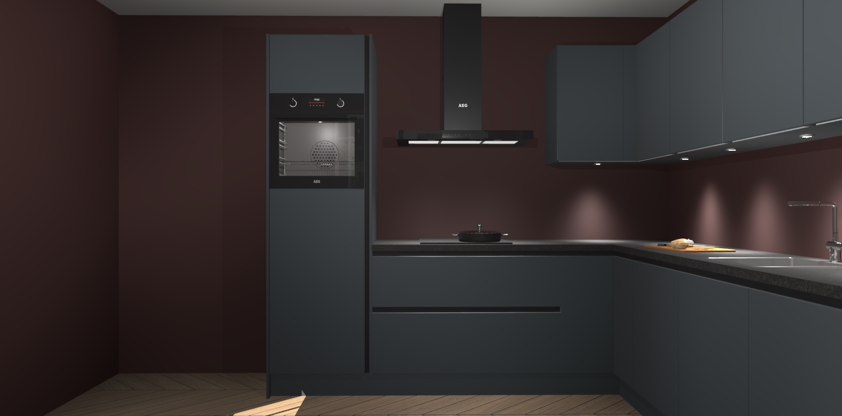 De Onyxygrijze greeploze keuken Debar is uitgerust met vijf inbouwapparaten die elke kooktaak handig en efficiënt maken. Een oven, inductiekookplaat, afzuigkap, vaatwasser en koelkast zijn standaard, maar kunnen na bestelling eenvoudig worden geupgrade naar AEG. Profiteer vervolgens van de softclose deuren voor snelle toegang en geruisloze toegang.