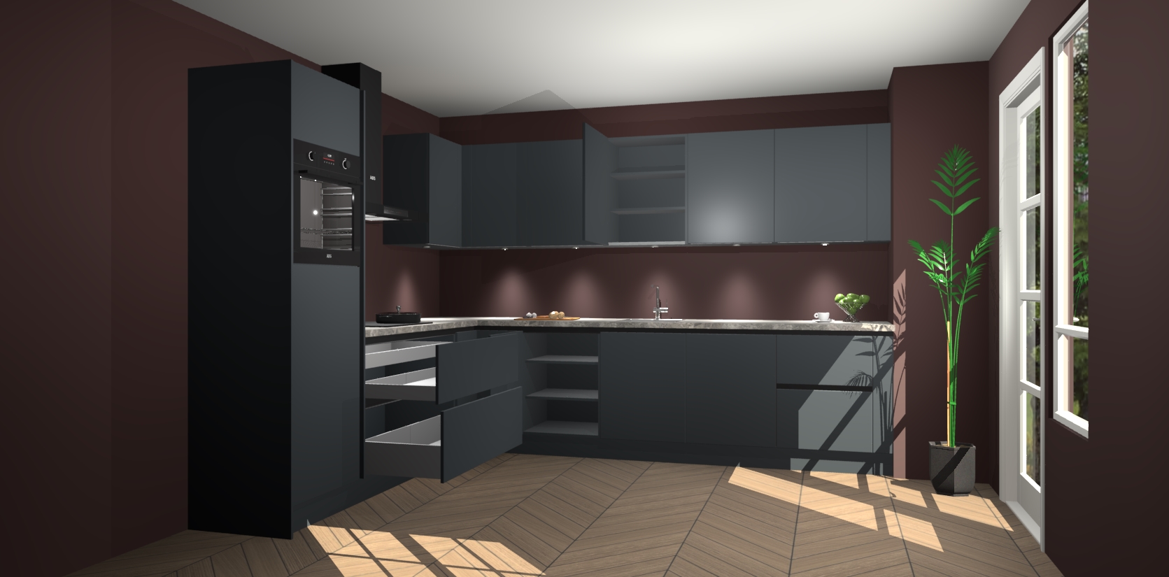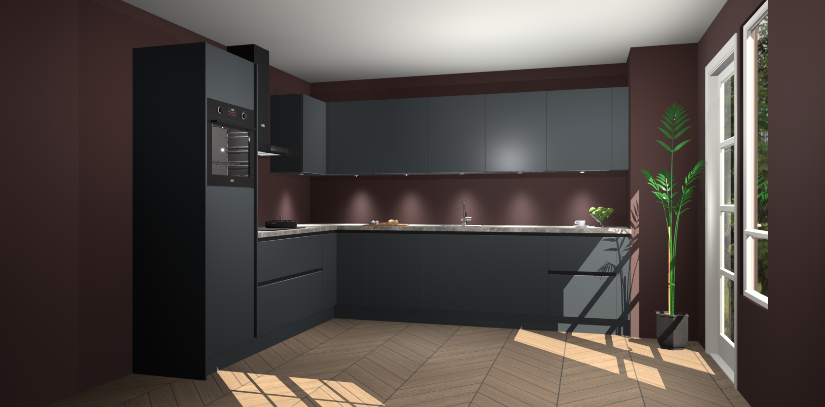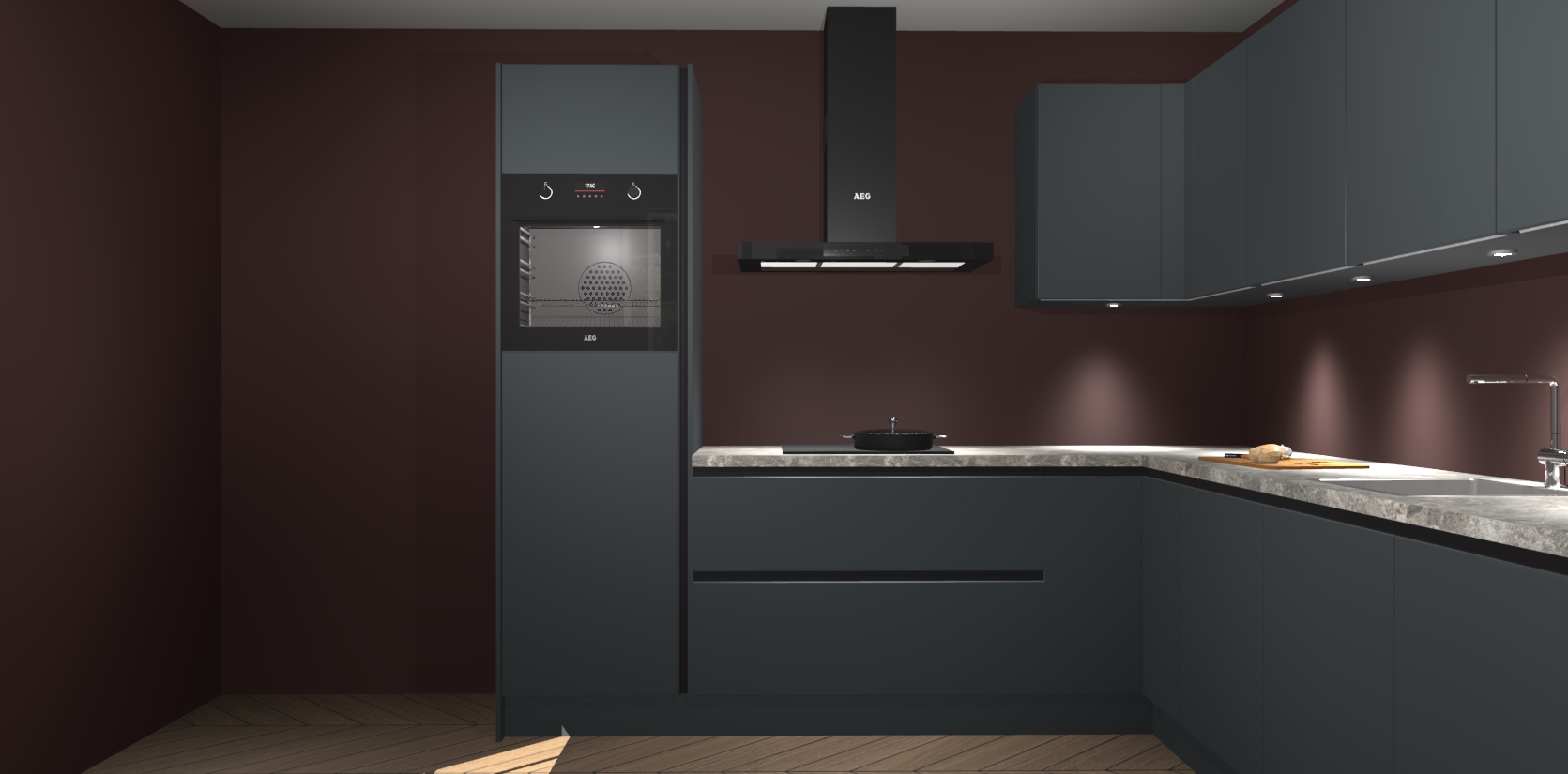 De Onyxygrijze greeploze keuken Debar is uitgerust met vijf inbouwapparaten die elke kooktaak handig en efficiënt maken. Een oven, inductiekookplaat, afzuigkap, vaatwasser en koelkast zijn standaard, maar kunnen na bestelling eenvoudig worden geupgrade naar AEG. Profiteer vervolgens van de softclose deuren voor snelle toegang en geruisloze toegang.