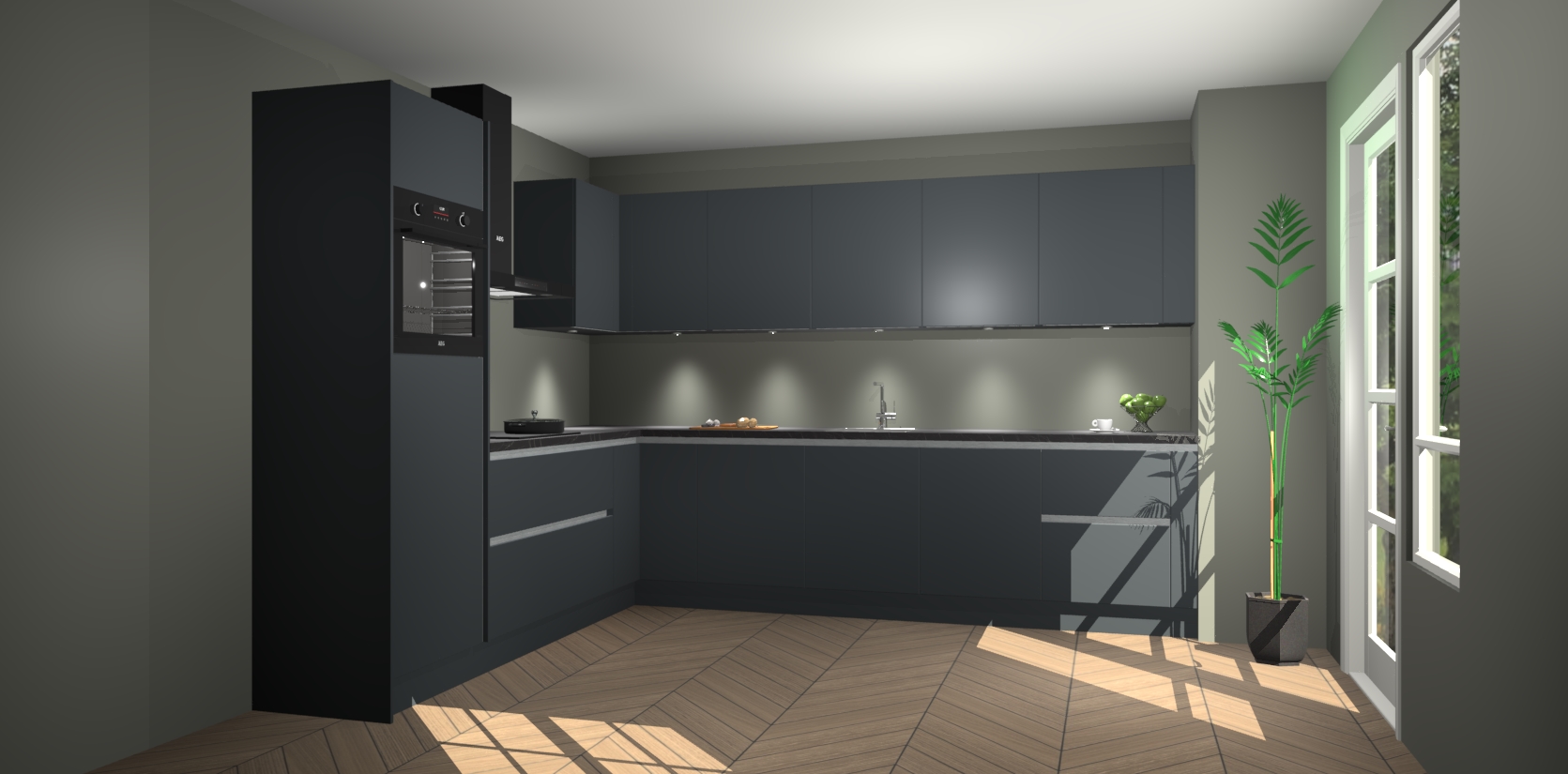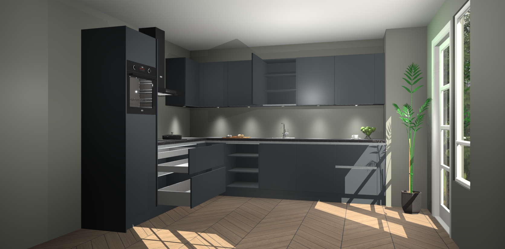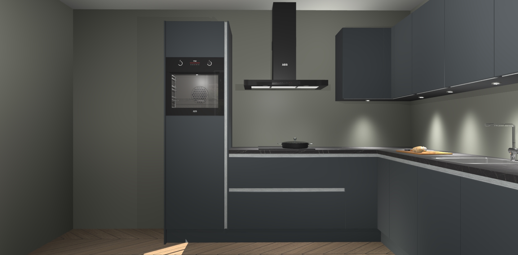 De Onyxygrijze greeploze keuken Debar is uitgerust met vijf inbouwapparaten die elke kooktaak handig en efficiënt maken. Een oven, inductiekookplaat, afzuigkap, vaatwasser en koelkast zijn standaard, maar kunnen na bestelling eenvoudig worden geupgrade naar AEG. Profiteer vervolgens van de softclose deuren voor snelle toegang en geruisloze toegang.