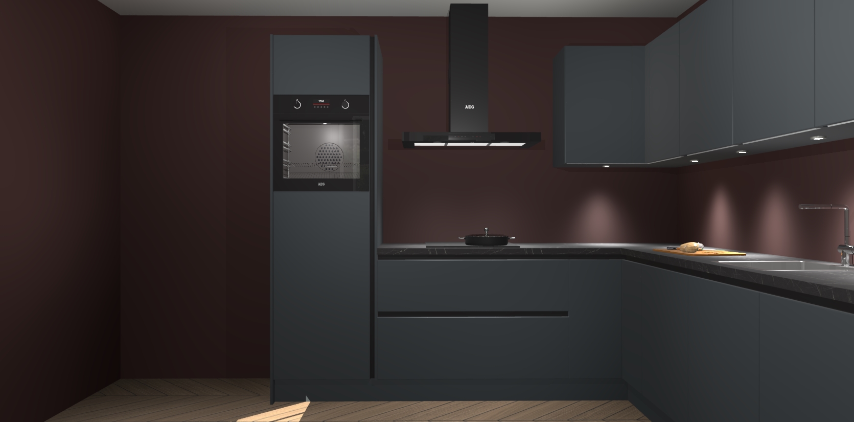De Onyxygrijze greeploze keuken Debar is uitgerust met vijf inbouwapparaten die elke kooktaak handig en efficiënt maken. Een oven, inductiekookplaat, afzuigkap, vaatwasser en koelkast zijn standaard, maar kunnen na bestelling eenvoudig worden geupgrade naar AEG. Profiteer vervolgens van de softclose deuren voor snelle toegang en geruisloze toegang.