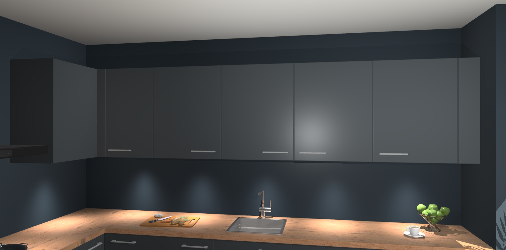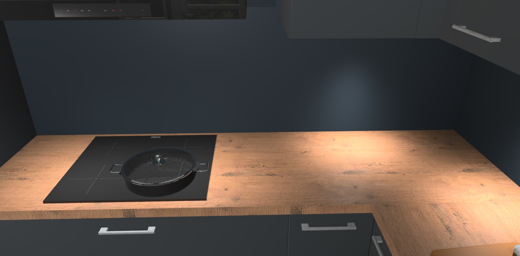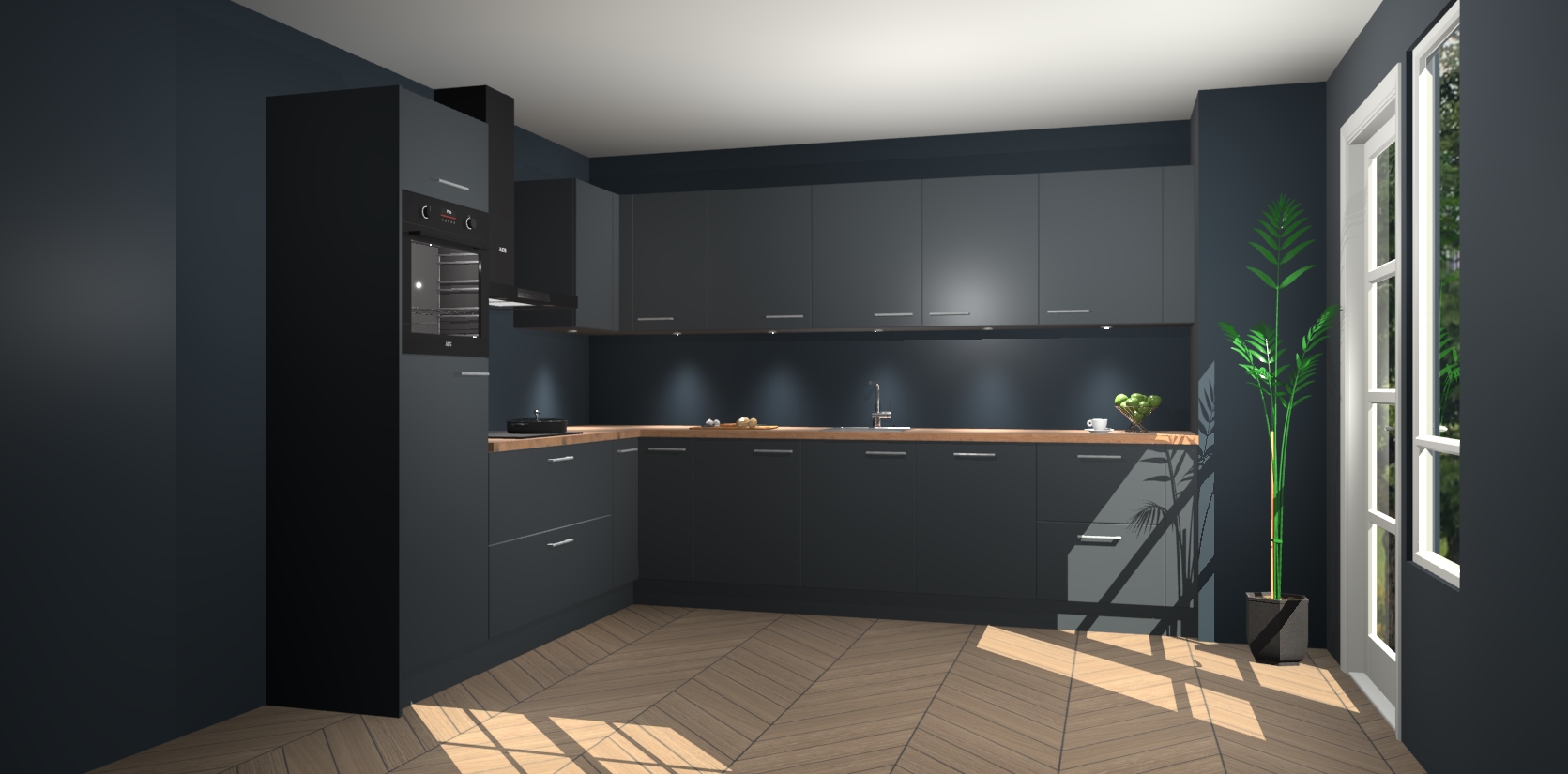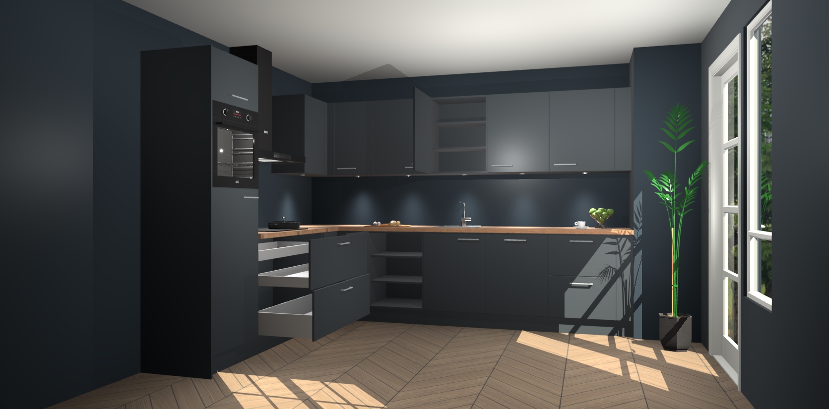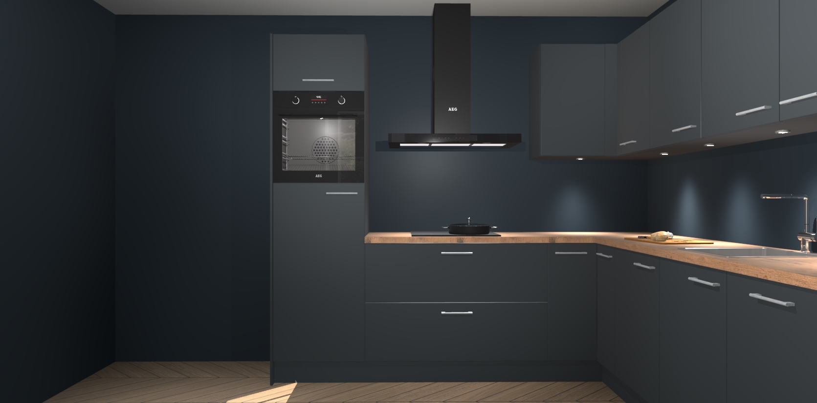 De Onyxygrijze keuken Debar is uitgerust met vijf inbouwapparaten die elke kooktaak handig en efficiënt maken. Een oven, inductiekookplaat, afzuigkap, vaatwasser en koelkast zijn standaard, maar kunnen na bestelling eenvoudig worden geupgrade naar AEG. Profiteer vervolgens van de softclose deuren voor snelle toegang en geruisloze toegang.