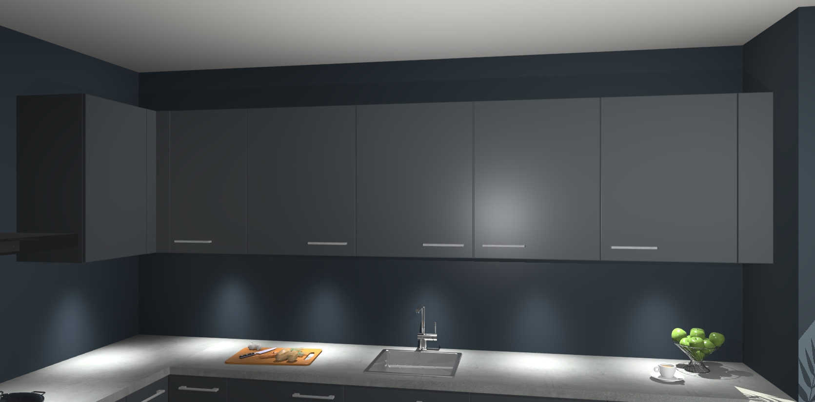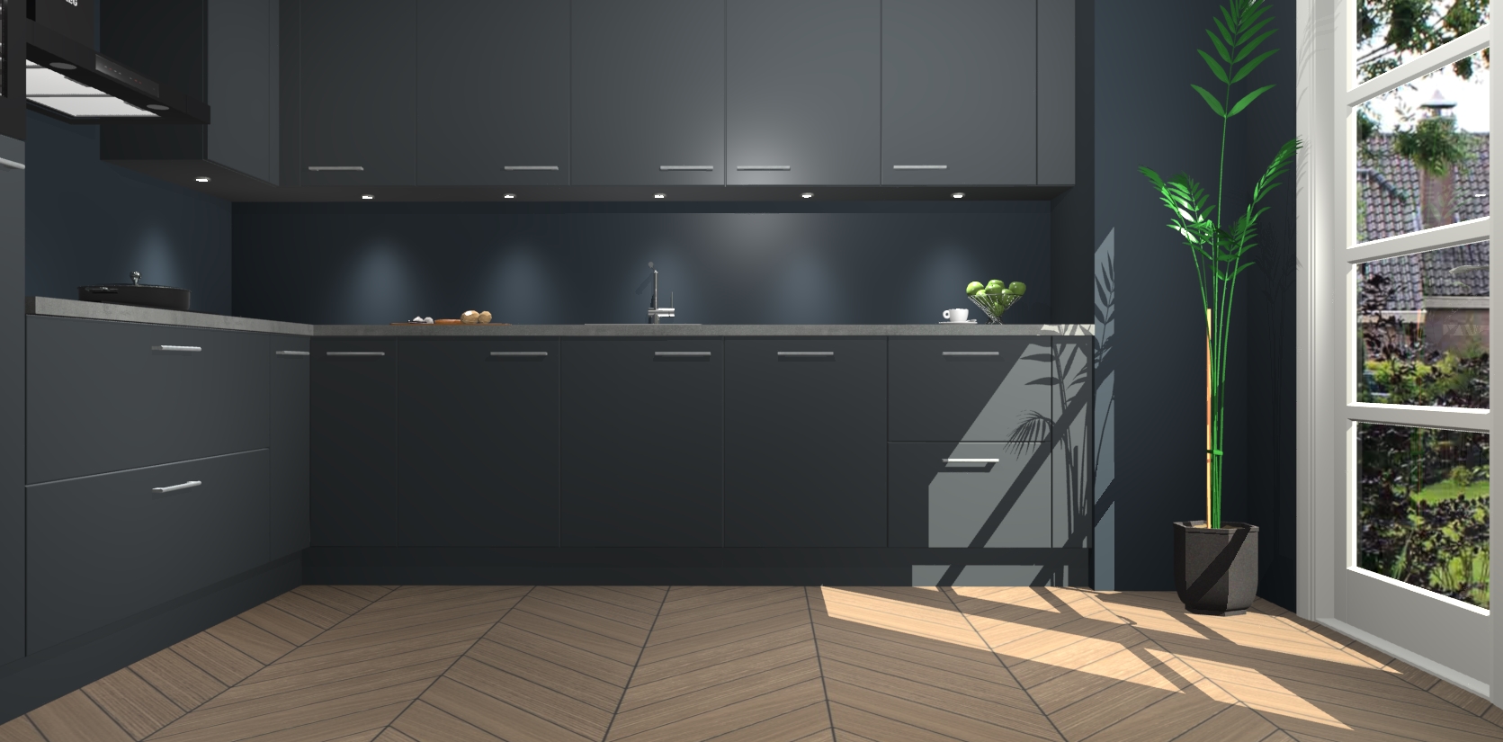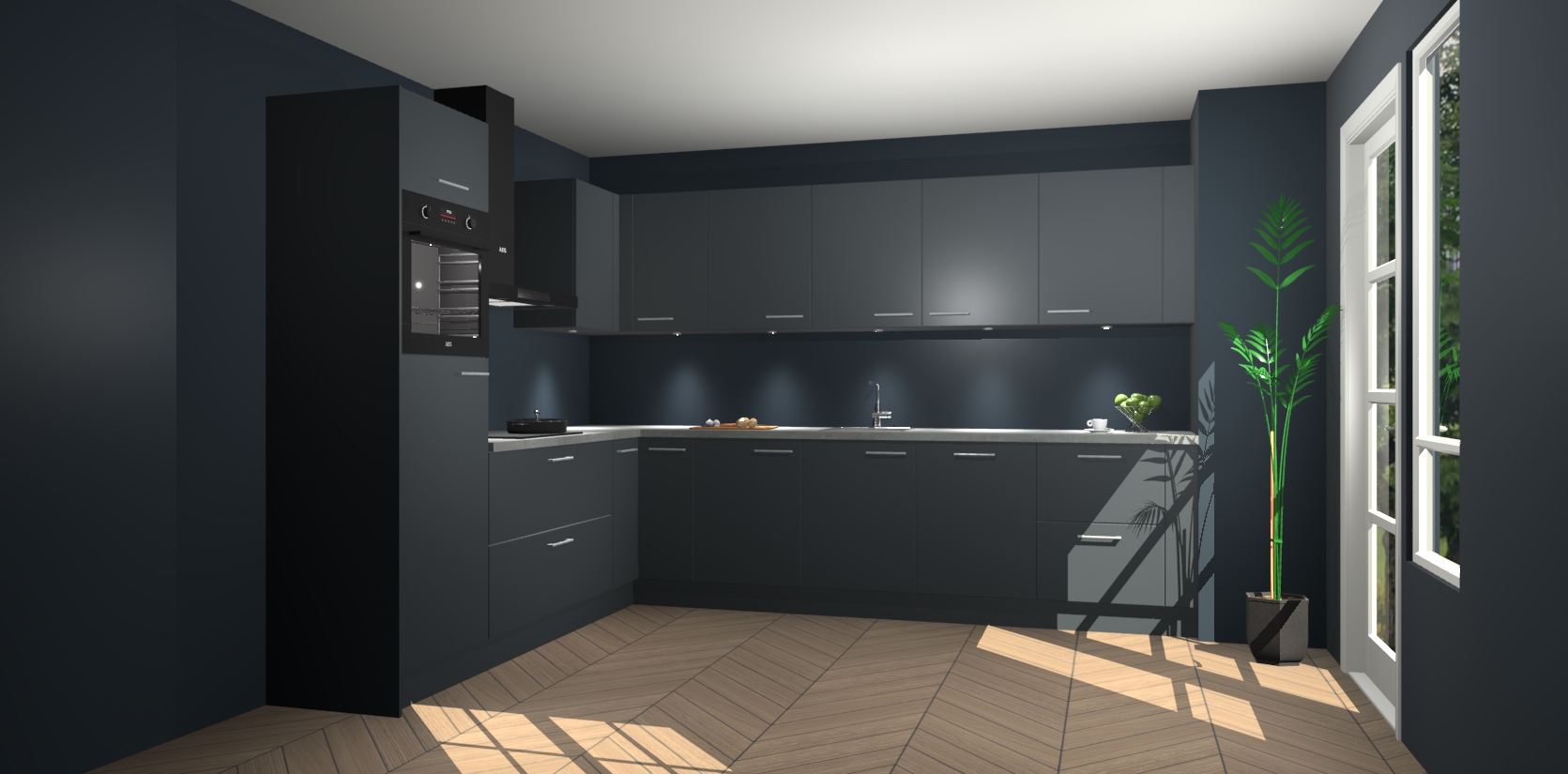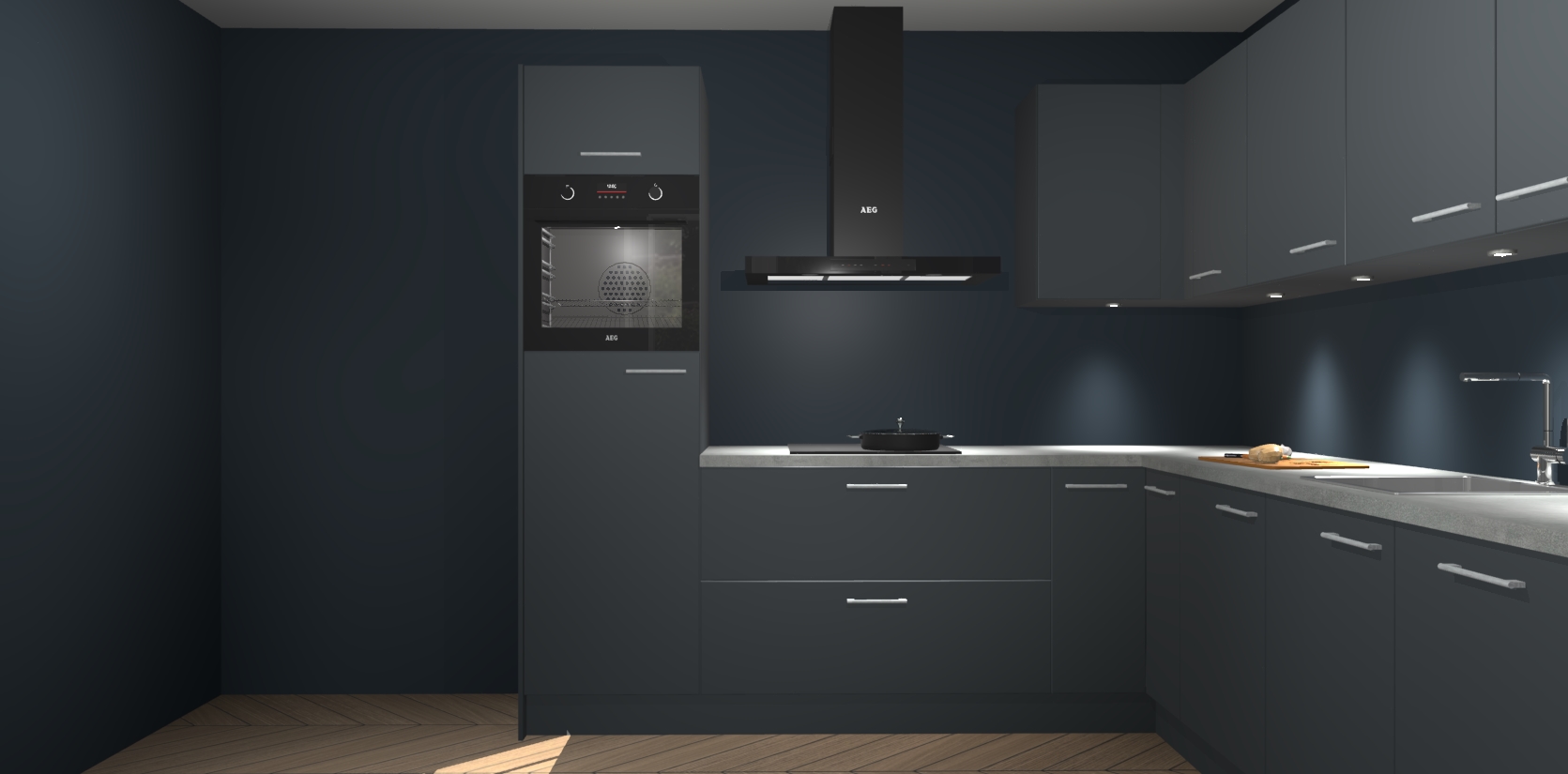 De Onyxygrijze keuken Debar is uitgerust met vijf inbouwapparaten die elke kooktaak handig en efficiënt maken. Een oven, inductiekookplaat, afzuigkap, vaatwasser en koelkast zijn standaard, maar kunnen na bestelling eenvoudig worden geupgrade naar AEG. Profiteer vervolgens van de softclose deuren voor snelle toegang en geruisloze toegang.
