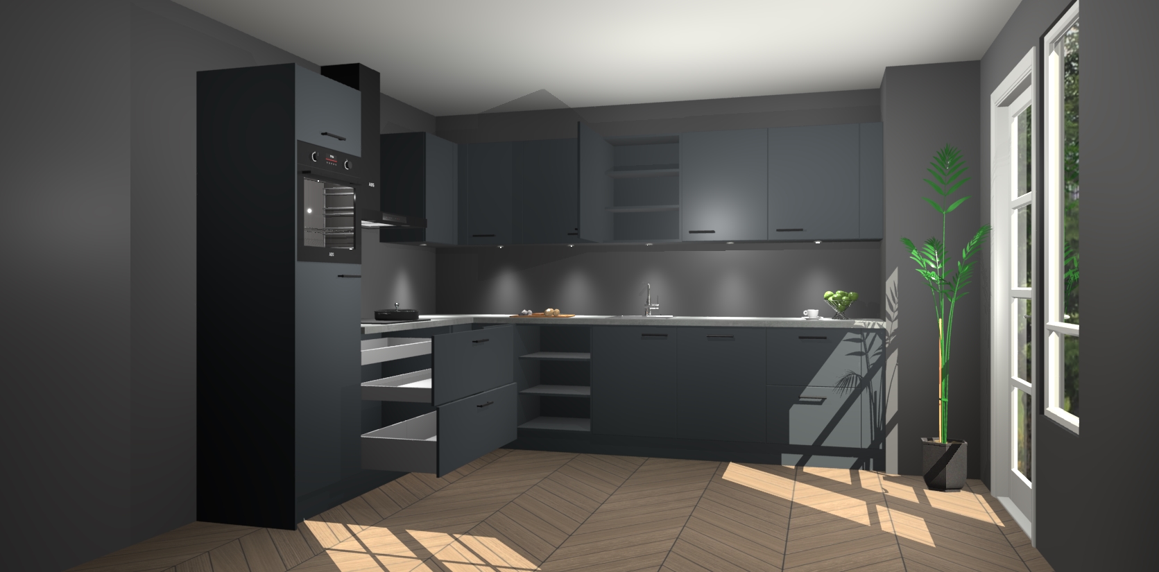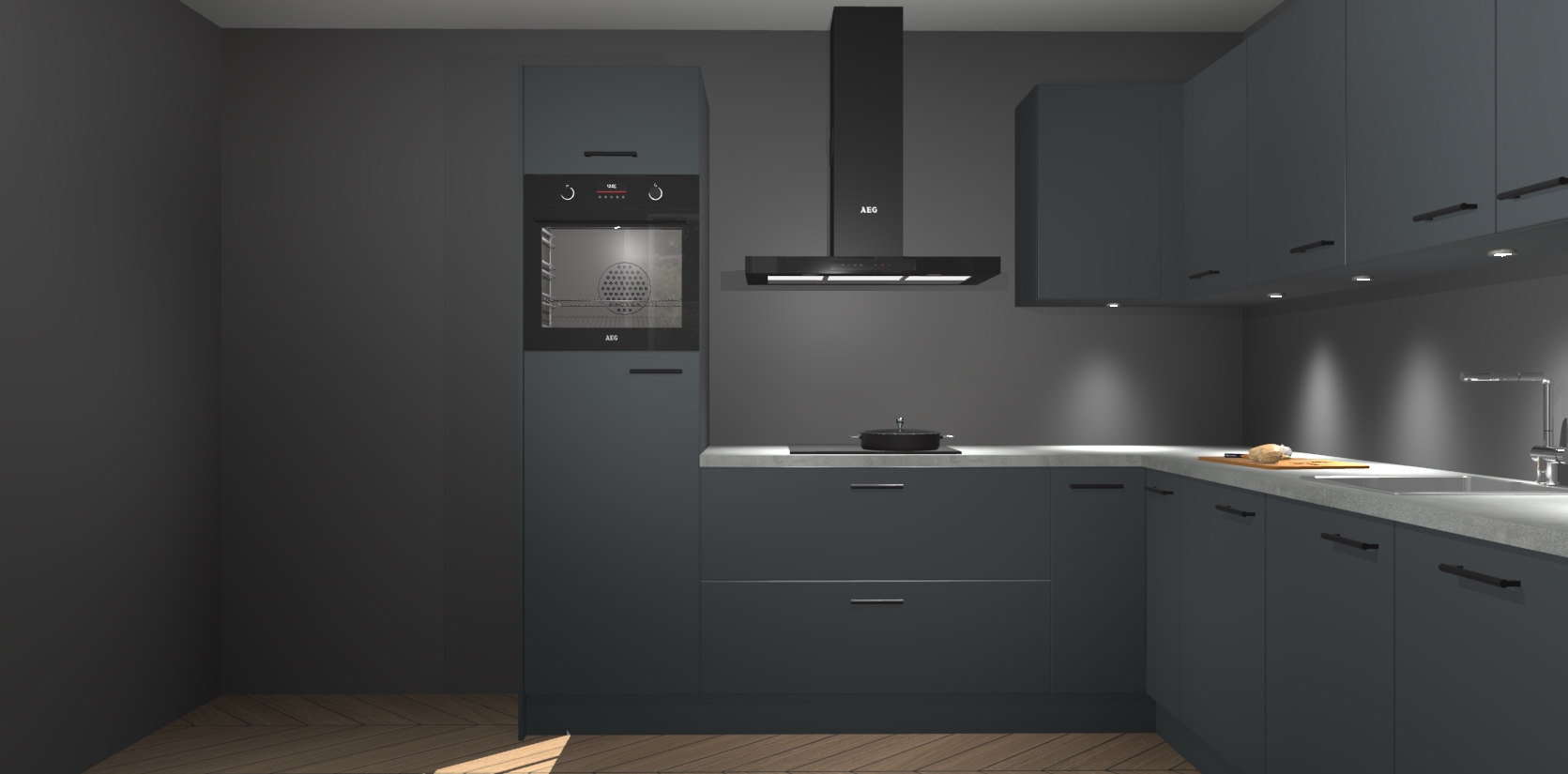De Onyxygrijze keuken Debar is uitgerust met vijf inbouwapparaten die elke kooktaak handig en efficiënt maken. Een oven, inductiekookplaat, afzuigkap, vaatwasser en koelkast zijn standaard, maar kunnen na bestelling eenvoudig worden geupgrade naar AEG. Profiteer vervolgens van de softclose deuren voor snelle toegang en geruisloze toegang.