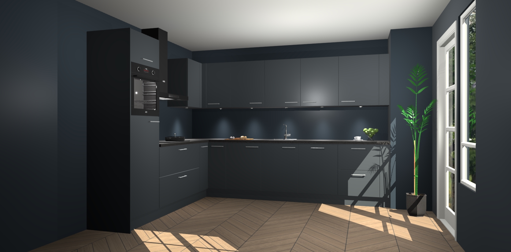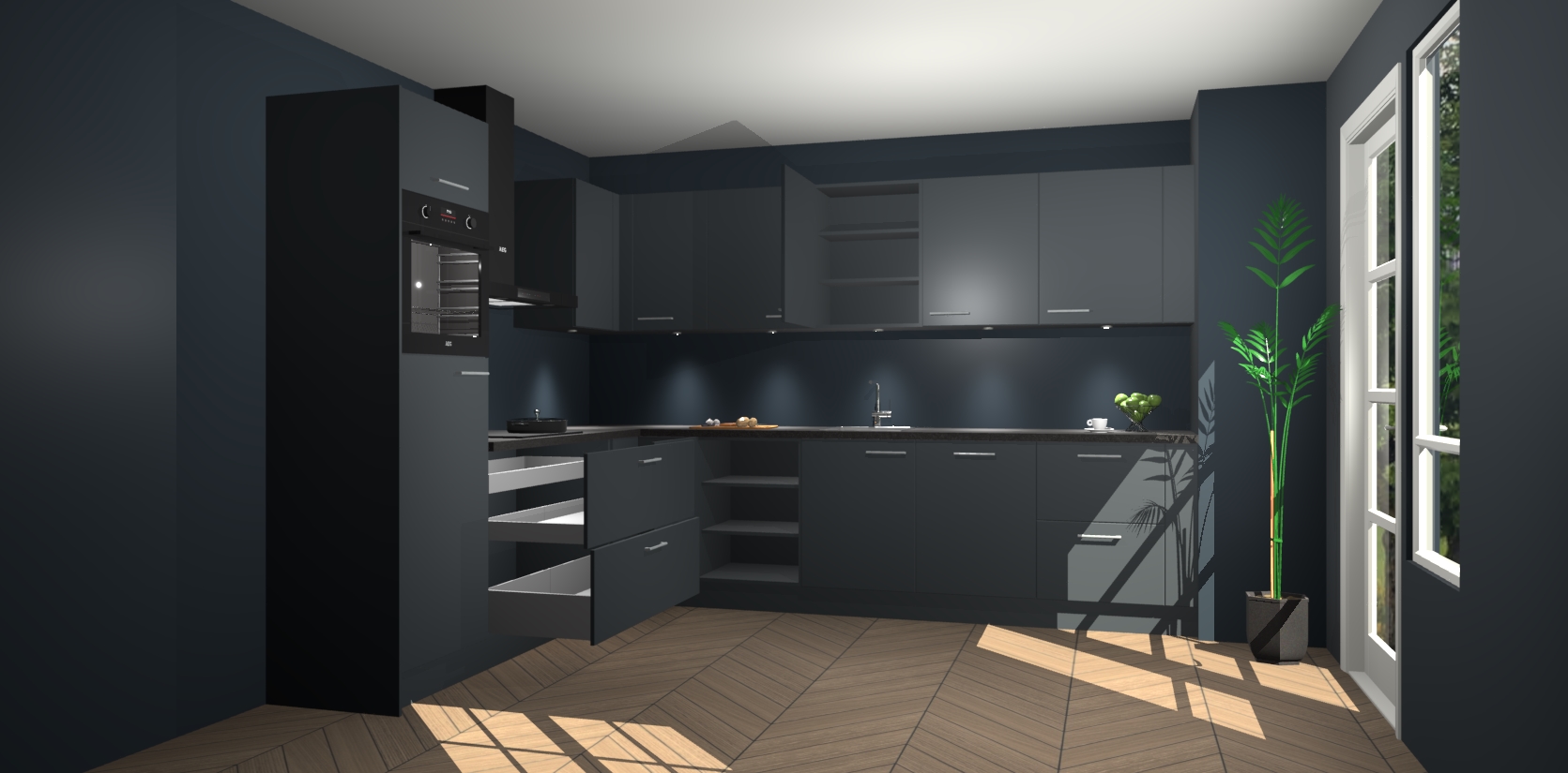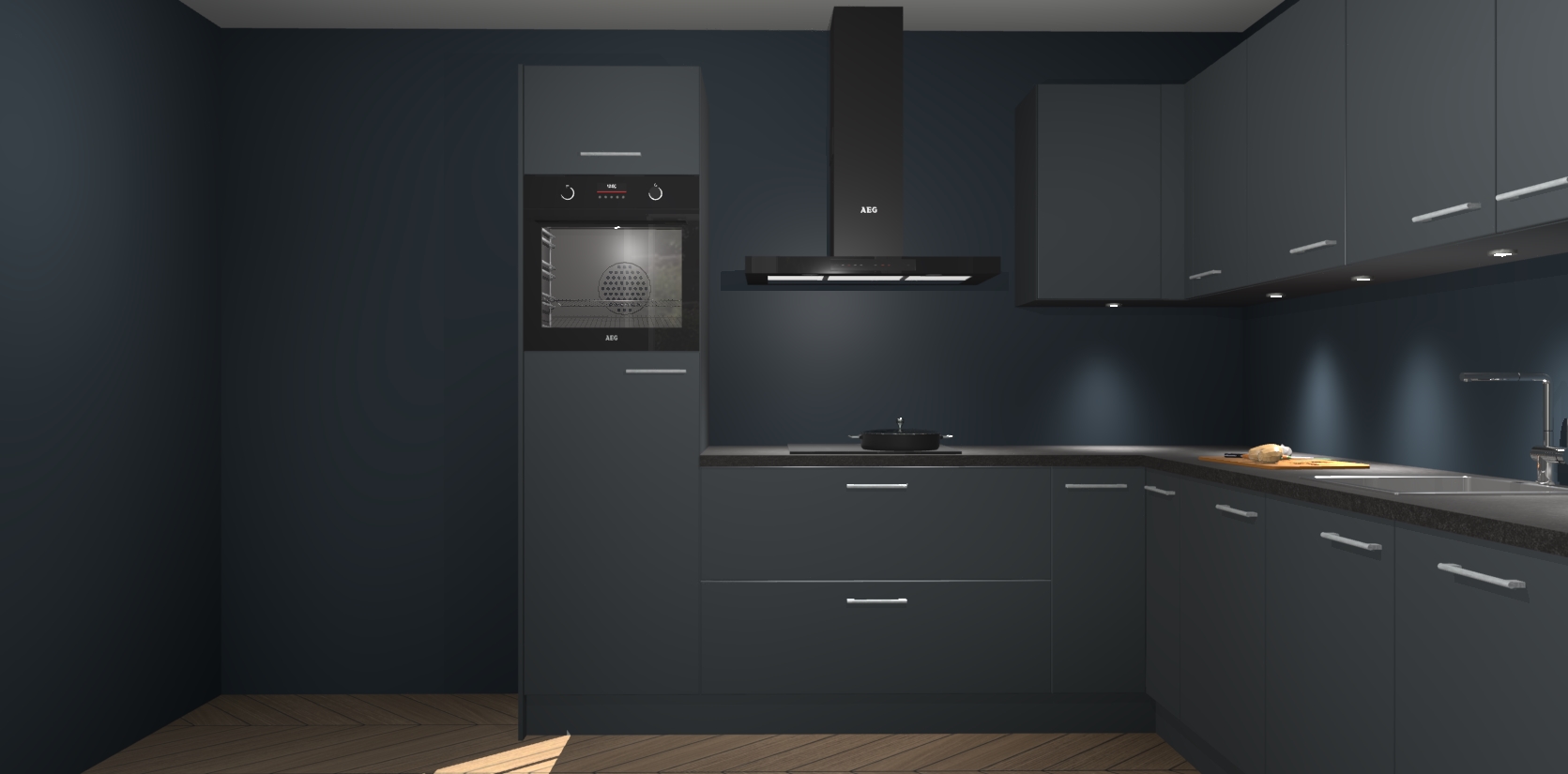 De Onyxygrijze keuken Debar is uitgerust met vijf inbouwapparaten die elke kooktaak handig en efficiënt maken. Een oven, inductiekookplaat, afzuigkap, vaatwasser en koelkast zijn standaard, maar kunnen na bestelling eenvoudig worden geupgrade naar AEG. Profiteer vervolgens van de softclose deuren voor snelle toegang en geruisloze toegang.