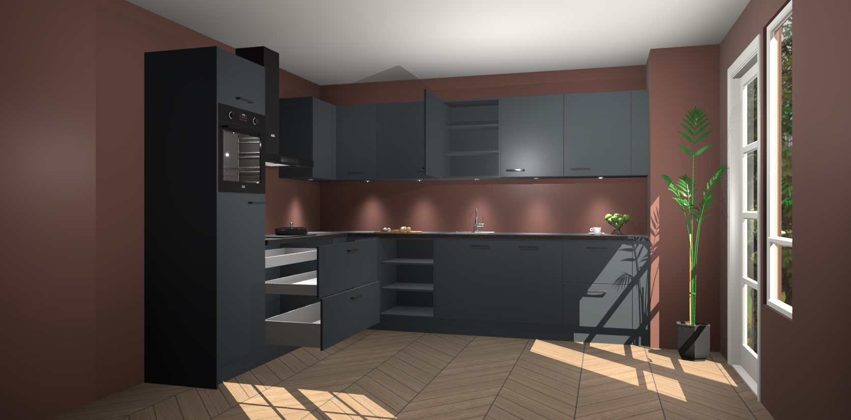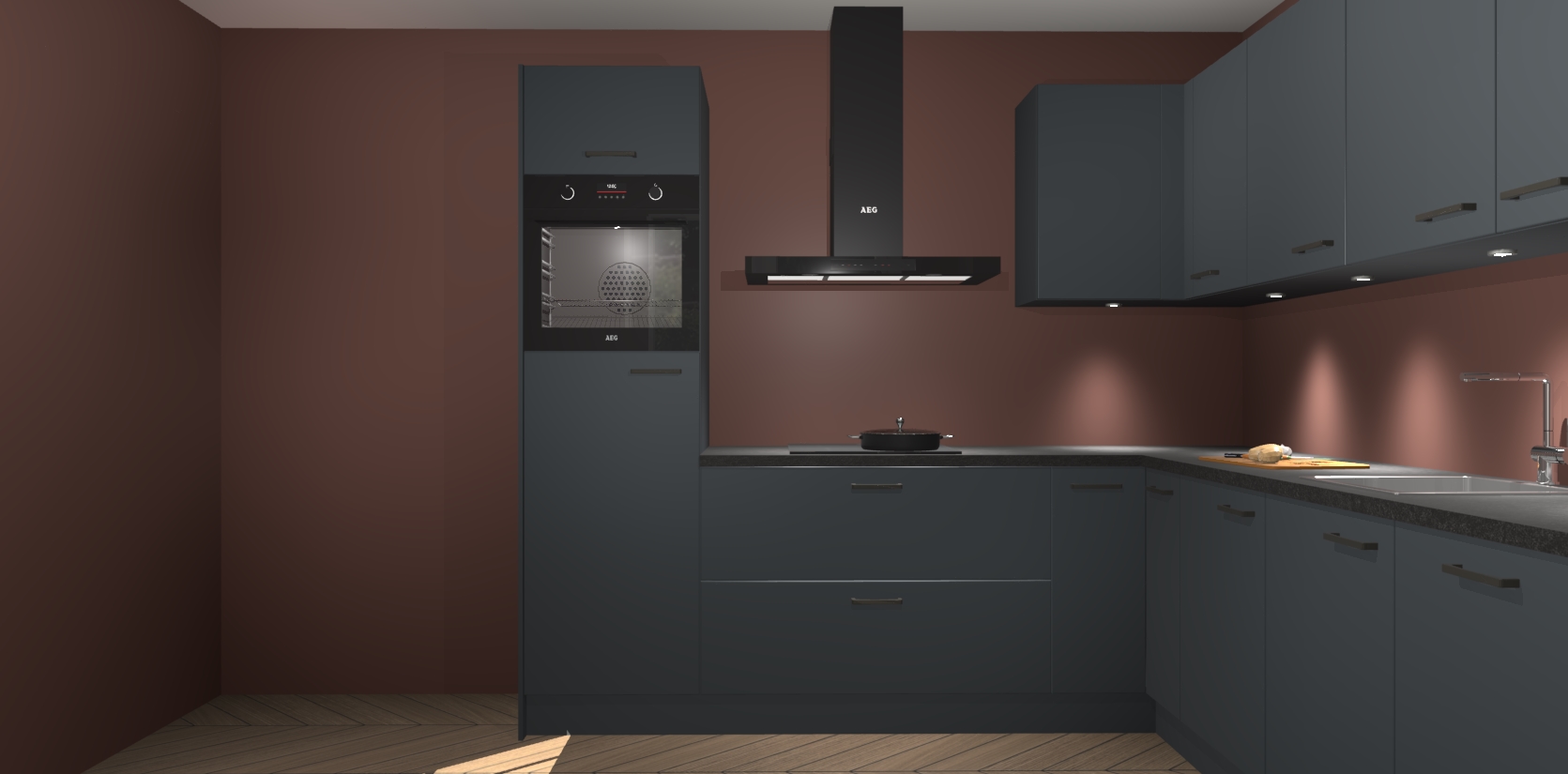 De Onyxygrijze keuken Debar is uitgerust met vijf inbouwapparaten die elke kooktaak handig en efficiënt maken. Een oven, inductiekookplaat, afzuigkap, vaatwasser en koelkast zijn standaard, maar kunnen na bestelling eenvoudig worden geupgrade naar AEG. Profiteer vervolgens van de softclose deuren voor snelle toegang en geruisloze toegang.