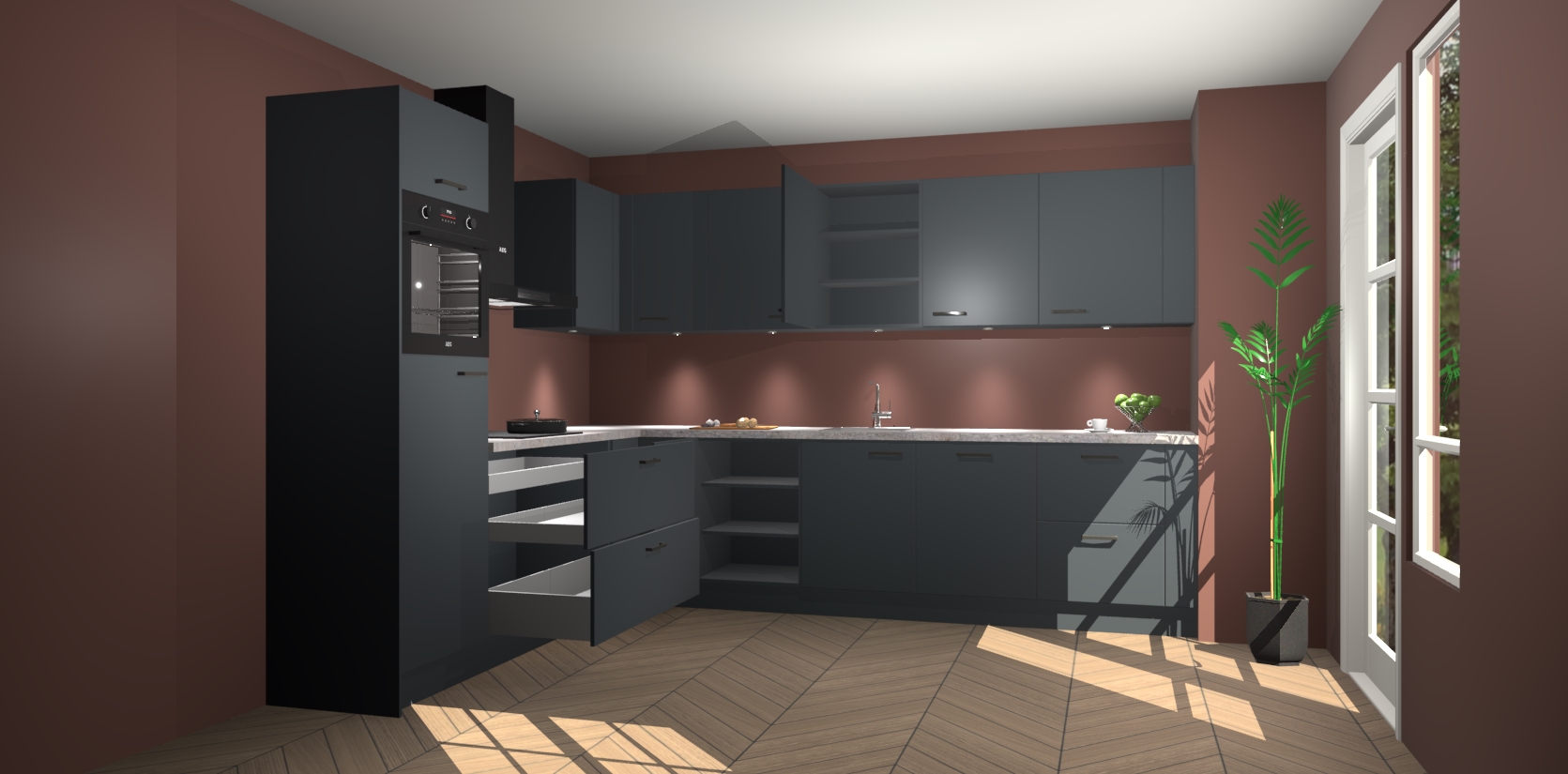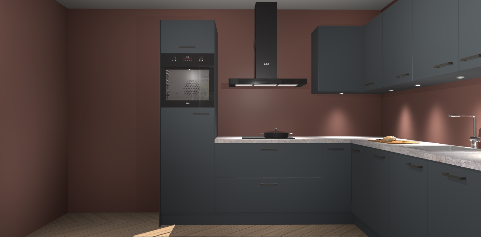 De Onyxygrijze keuken Debar is uitgerust met vijf inbouwapparaten die elke kooktaak handig en efficiënt maken. Een oven, inductiekookplaat, afzuigkap, vaatwasser en koelkast zijn standaard, maar kunnen na bestelling eenvoudig worden geupgrade naar AEG. Profiteer vervolgens van de softclose deuren voor snelle toegang en geruisloze toegang.