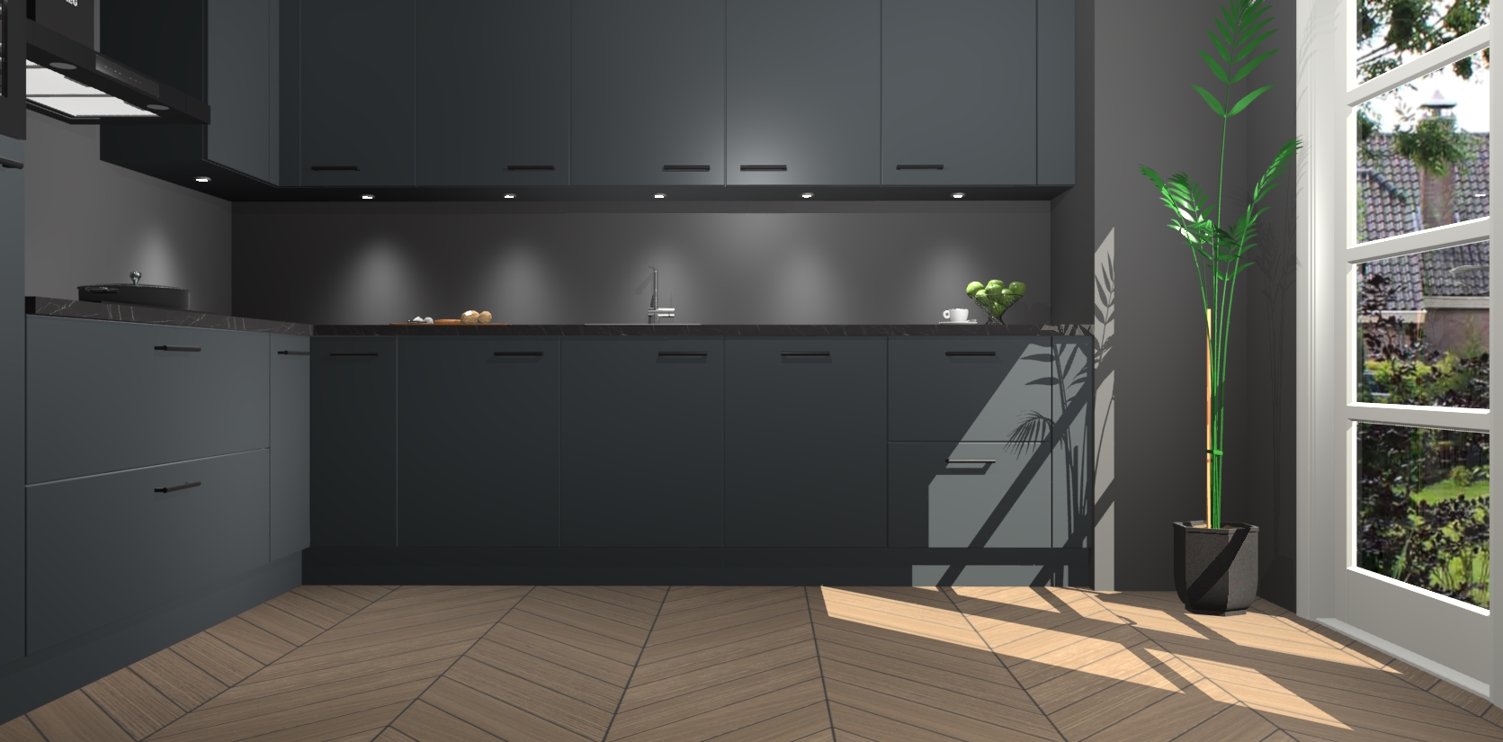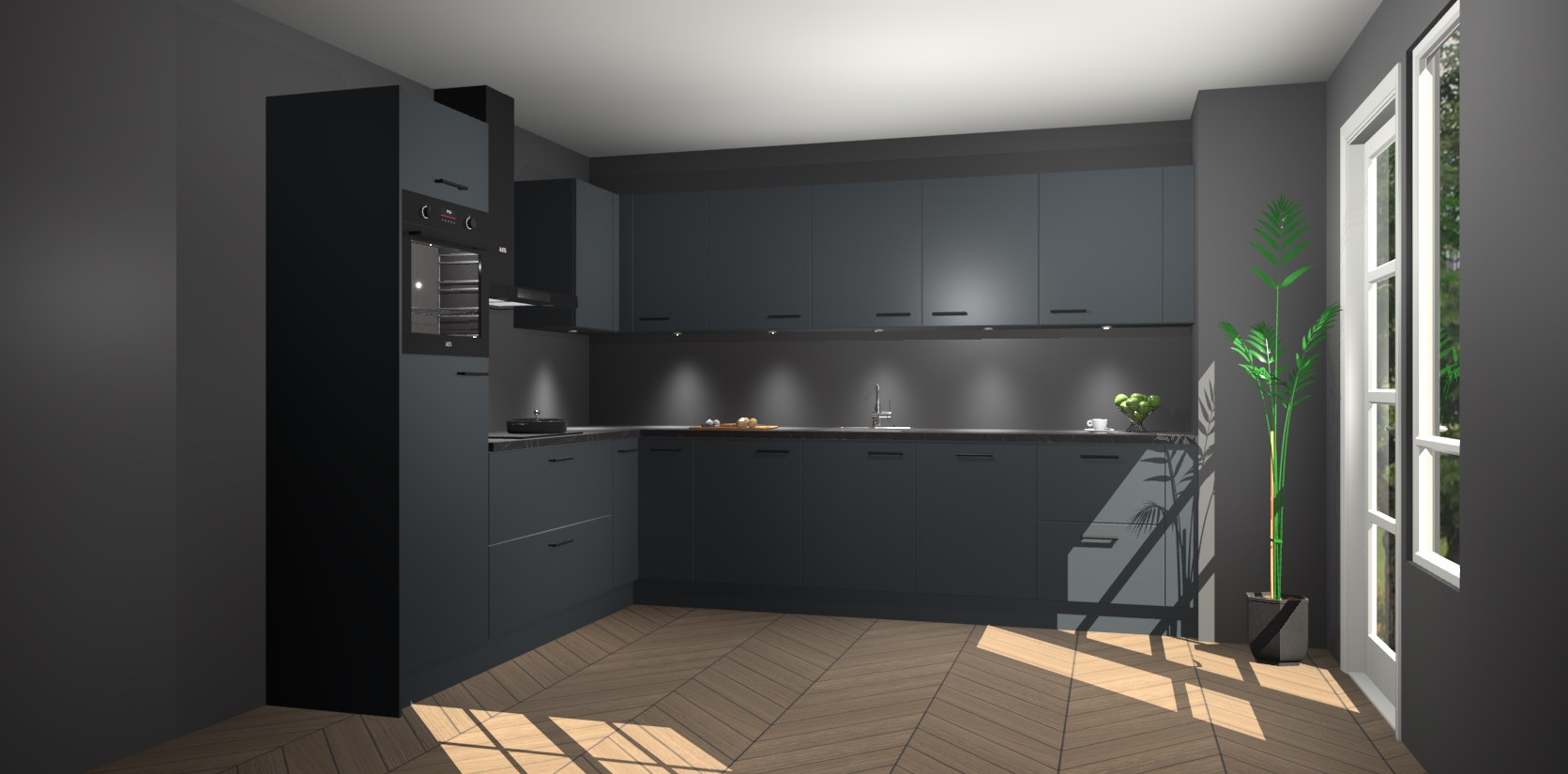De Onyxygrijze keuken Debar is uitgerust met vijf inbouwapparaten die elke kooktaak handig en efficiënt maken. Een oven, inductiekookplaat, afzuigkap, vaatwasser en koelkast zijn standaard, maar kunnen na bestelling eenvoudig worden geupgrade naar AEG. Profiteer vervolgens van de softclose deuren voor snelle toegang en geruisloze toegang.