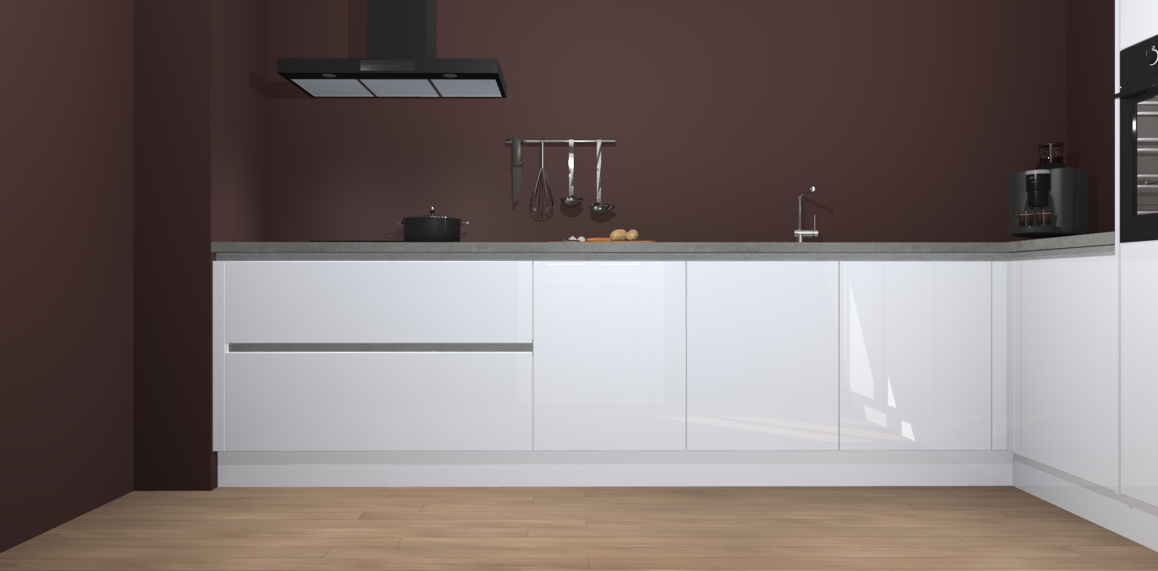 Welkom bij de Sneeuwwitte hoogglans greeploze keuken Portland. Deze prachtige keuken zal de komende jaren het middelpunt van de belangstelling in uw huis zijn. Uitgerust met vijf inbouwapparaten komt u nooit kookgereedschap tekort. Bovendien geeft de warme houtlook elke ruimte een uitnodigende en tijdloze uitstraling.