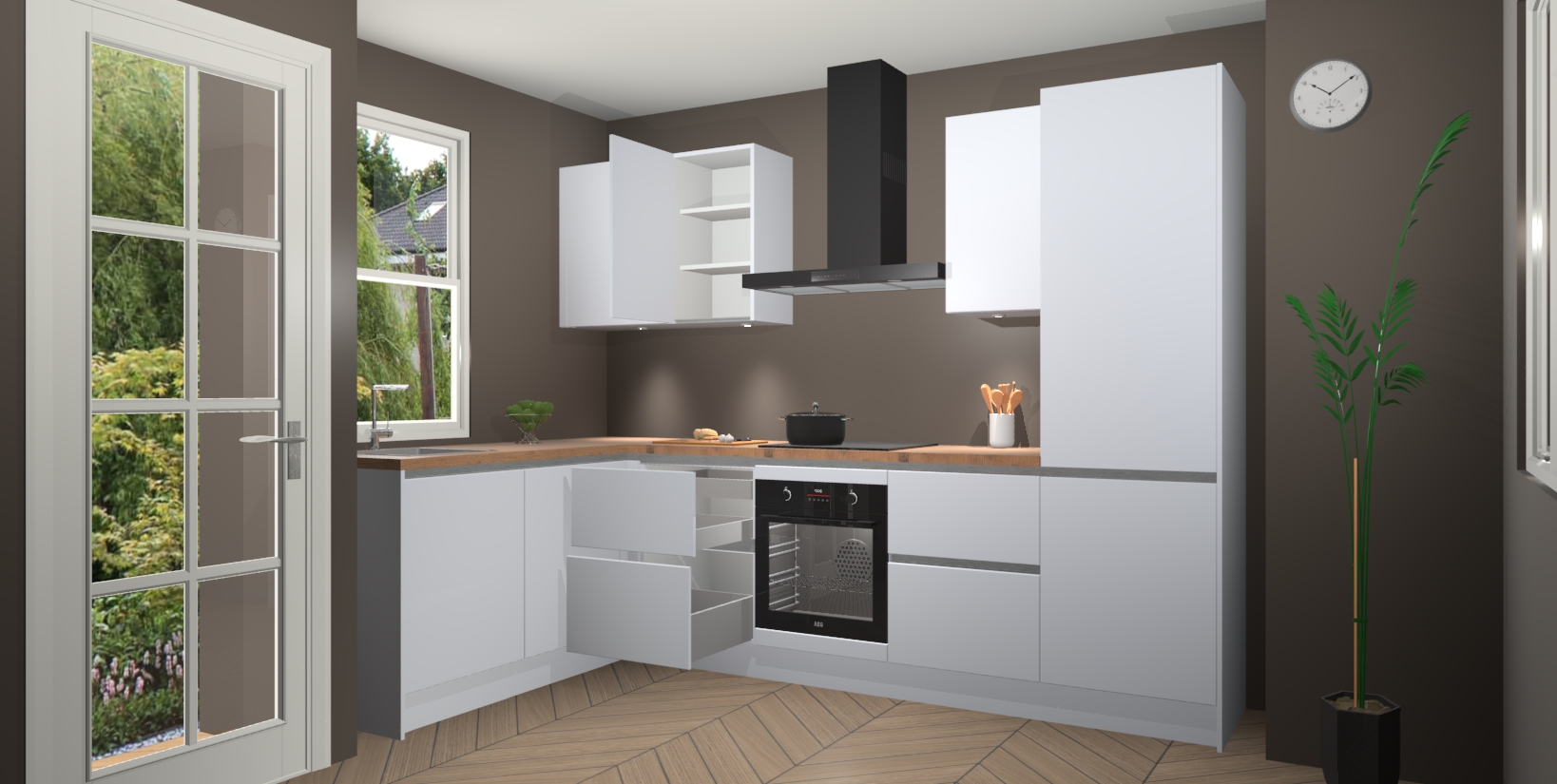 U hoeft zich ook geen zorgen te maken over een gebrek aan opbergruimte, want deze keuken heeft voldoende opbergmogelijkheden zowel boven als onder het aanrecht. Om het leven nog makkelijker te maken, wordt deze moderne hoekkeuken geleverd met 5 ingebouwde apparaten, waaronder een oven, inductiekookplaat, afzuigkap, vaatwasser en koelkast, zodat u in een mum van tijd klaar bent voor actie!