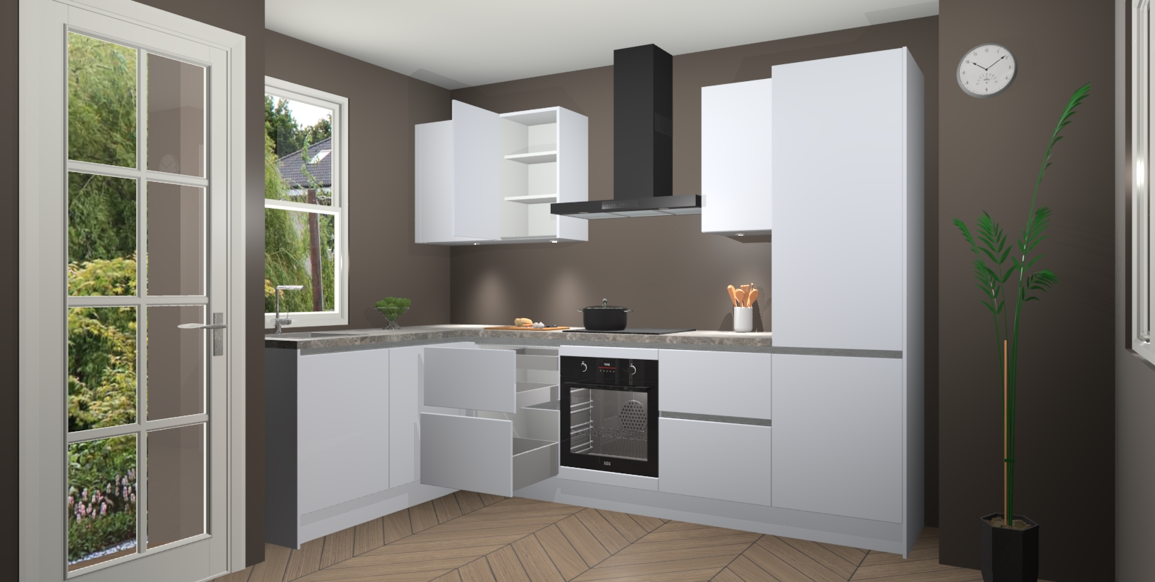 U hoeft zich ook geen zorgen te maken over een gebrek aan opbergruimte, want deze keuken heeft voldoende opbergmogelijkheden zowel boven als onder het aanrecht. Om het leven nog makkelijker te maken, wordt deze moderne hoekkeuken geleverd met 5 ingebouwde apparaten, waaronder een oven, inductiekookplaat, afzuigkap, vaatwasser en koelkast, zodat u in een mum van tijd klaar bent voor actie!