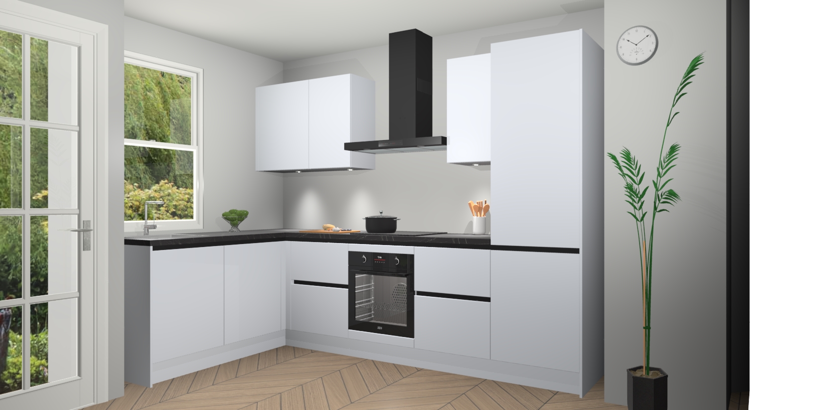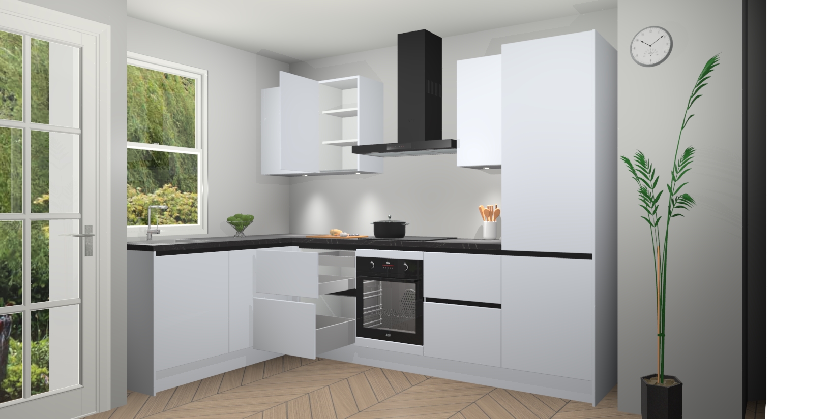 U hoeft zich ook geen zorgen te maken over een gebrek aan opbergruimte, want deze keuken heeft voldoende opbergmogelijkheden zowel boven als onder het aanrecht. Om het leven nog makkelijker te maken, wordt deze moderne hoekkeuken geleverd met 5 ingebouwde apparaten, waaronder een oven, inductiekookplaat, afzuigkap, vaatwasser en koelkast, zodat u in een mum van tijd klaar bent voor actie!