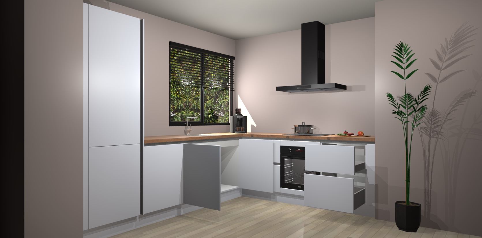 Met een modern, tijdloos design en ruime opslagruimte, zult u zich in no-time thuis voelen in uw nieuwe keuken. Uw leven wordt eenvoudiger met de soft-close deuren die voor het ultieme stille comfort zorgen - geen geluid dat u stoort terwijl u kookt. Ook is de keuken voorzien van 5 ingebouwde apparaten: een oven, inductie kookplaat, afzuigkap, vaatwasser en koelkast. Deze kunnen gemakkelijk na bestelling worden bijgewerkt naar AEG - waardoor uw luxe ervaring compleet is.