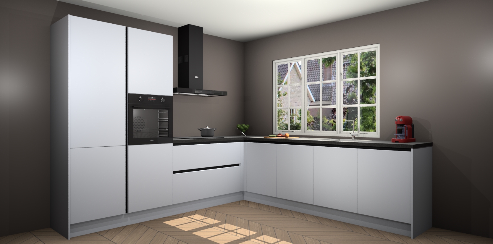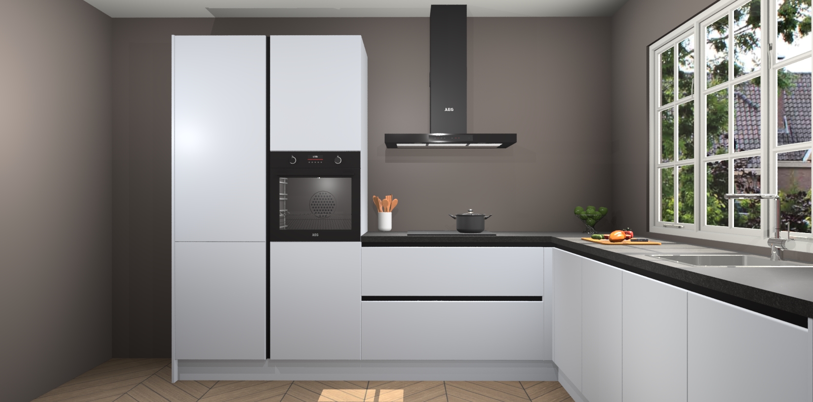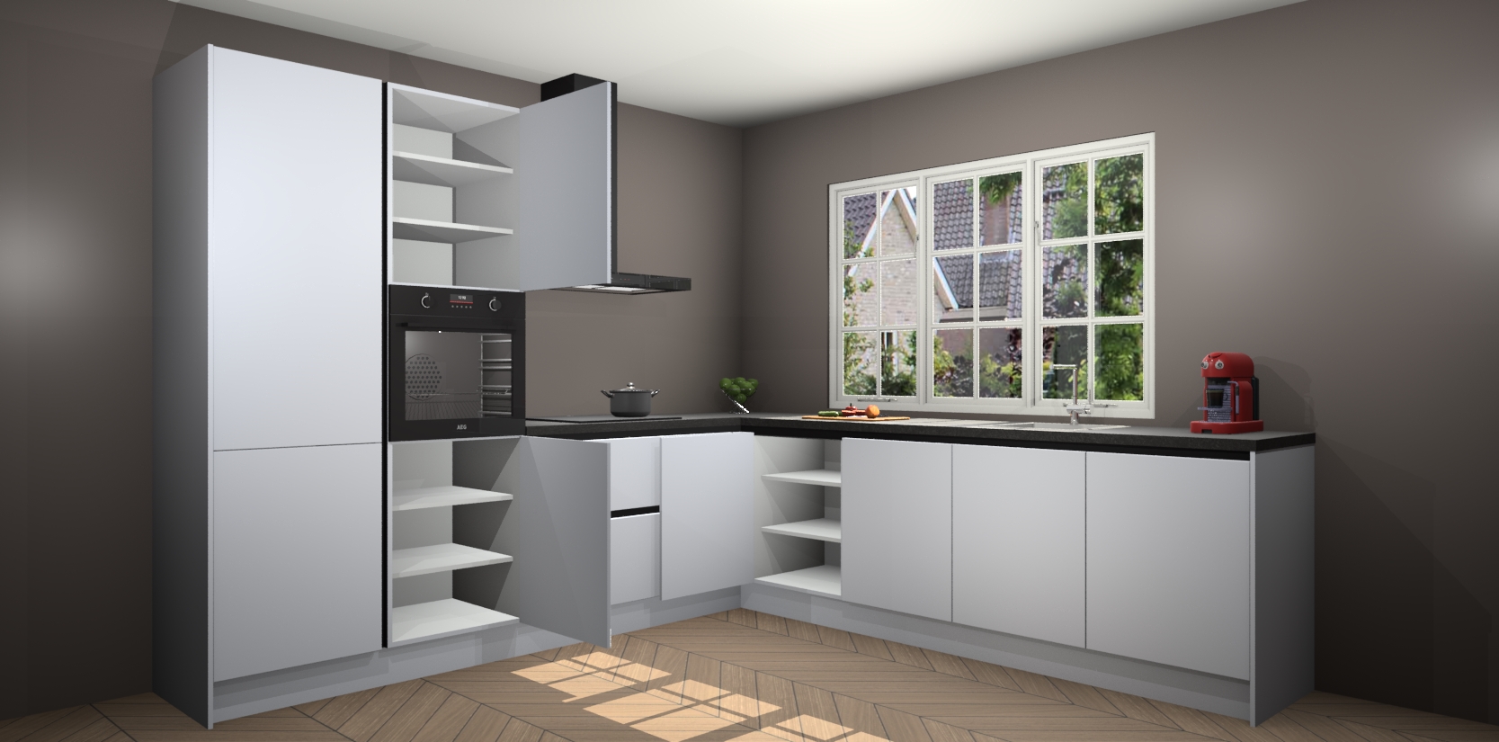 De keuken heeft veel opbergruimte, waardoor u alle ingrediënten gemakkelijk bereikbaar hebt staan. En daarnaast bevat deze volledig uitgeruste keuken ook 5 ingebouwde apparaten: een oven, inductiekookplaat, afzuigkap, vaatwasser en koelkast. Deze zijn heel eenvoudig na bestellen te upgraden naar AEG als u dit wilt. Bovendien zijn de softclose-kastdeuren ideaal; geef ze gewoon even een tikje en ze sluiten automatisch met geruisloze precisie.