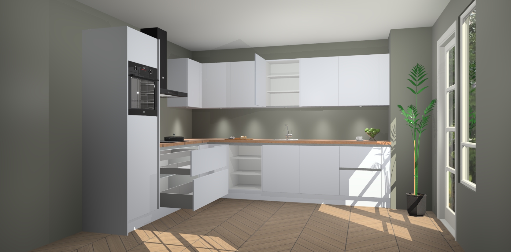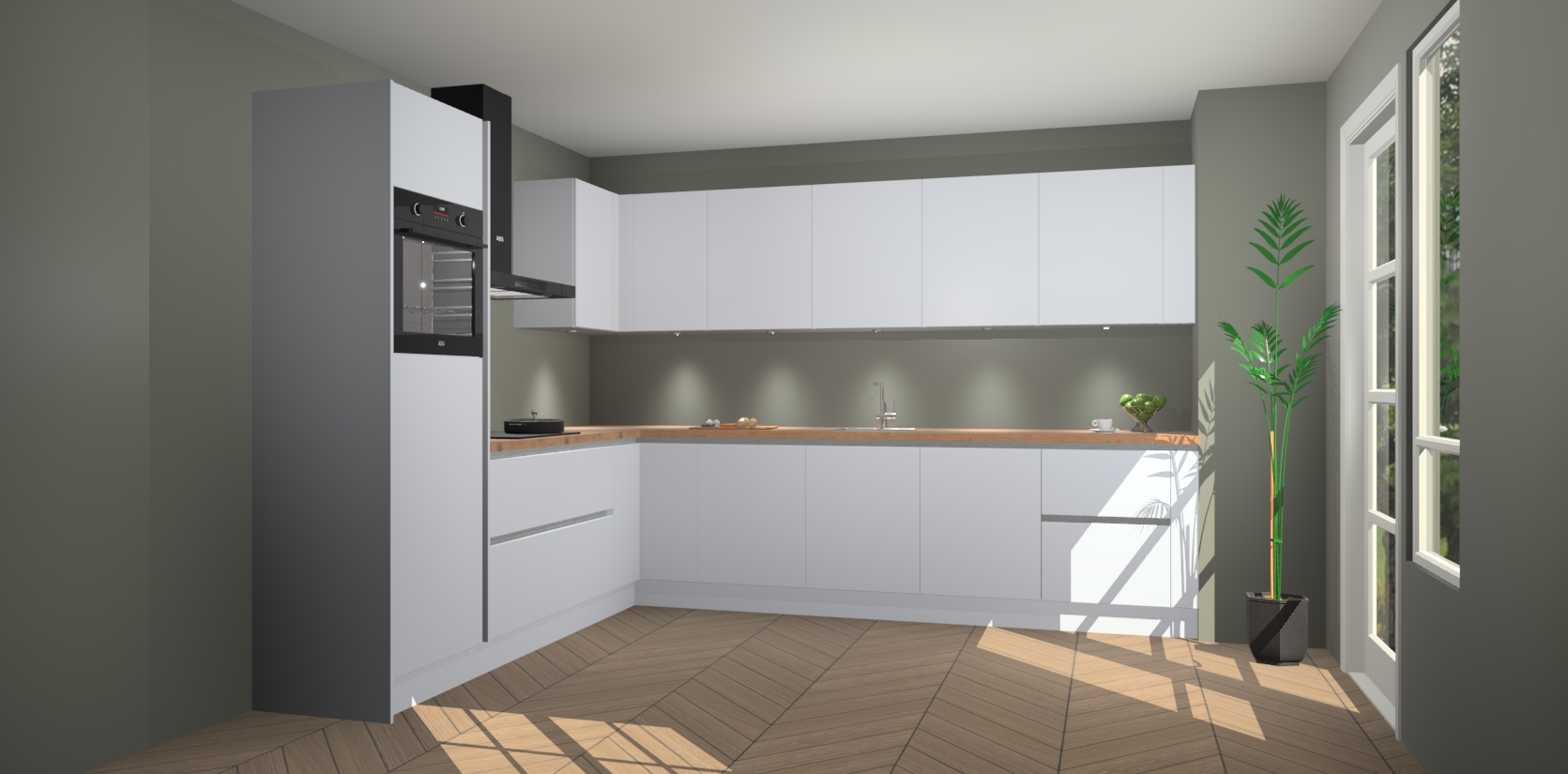 De Sneeuwwitte greeploze keuken Debar is uitgerust met vijf inbouwapparaten die elke kooktaak handig en efficiënt maken. Een oven, inductiekookplaat, afzuigkap, vaatwasser en koelkast zijn standaard, maar kunnen na bestelling eenvoudig worden geupgrade naar AEG. Profiteer vervolgens van de softclose deuren voor snelle toegang en geruisloze toegang.