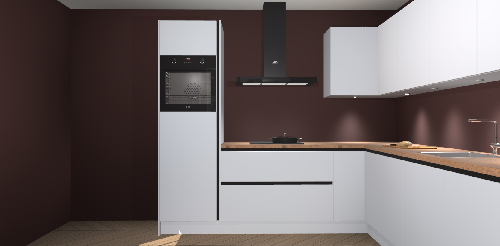 De Sneeuwwitte greeploze keuken Debar is uitgerust met vijf inbouwapparaten die elke kooktaak handig en efficiënt maken. Een oven, inductiekookplaat, afzuigkap, vaatwasser en koelkast zijn standaard, maar kunnen na bestelling eenvoudig worden geupgrade naar AEG. Profiteer vervolgens van de softclose deuren voor snelle toegang en geruisloze toegang.