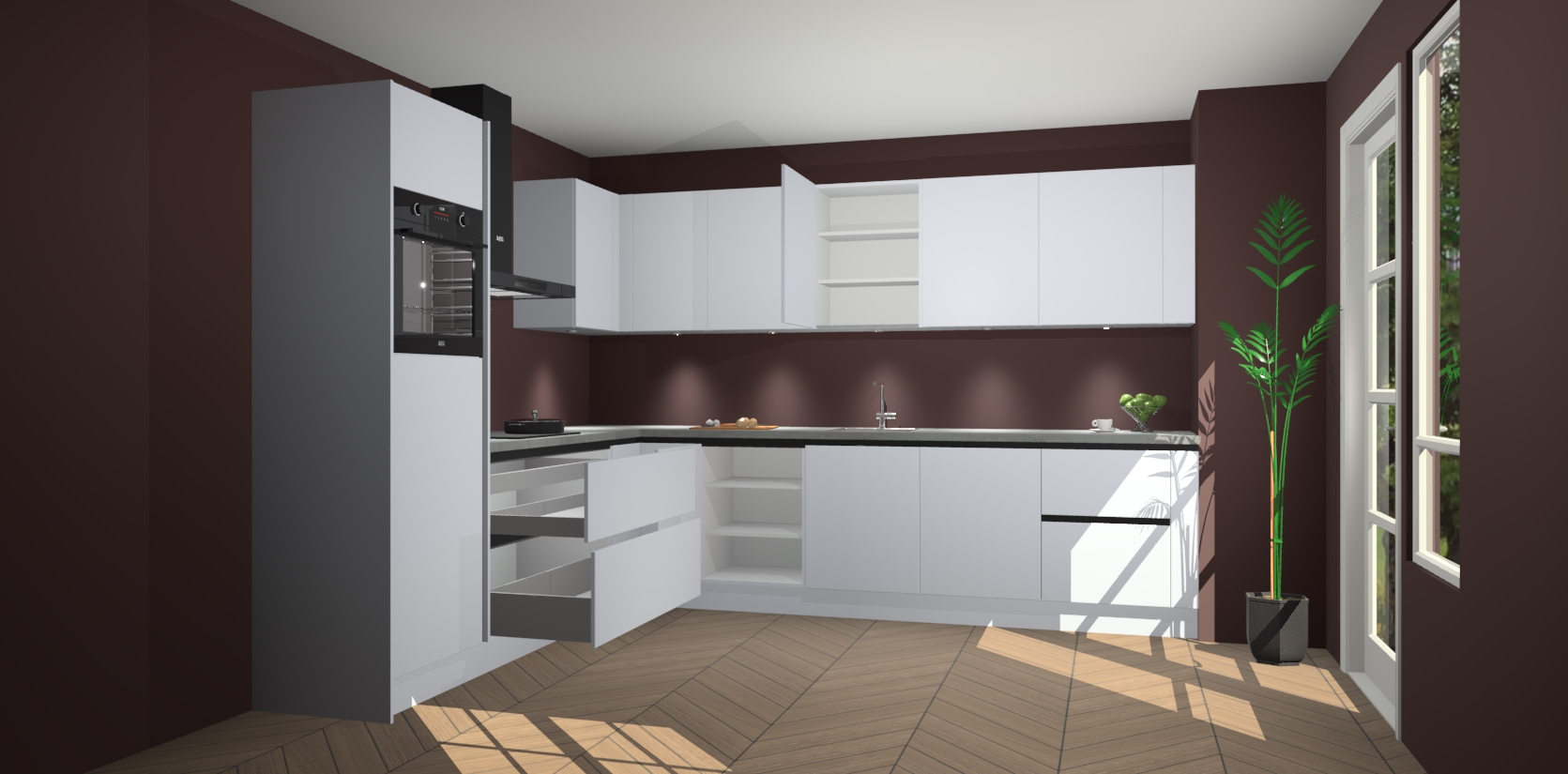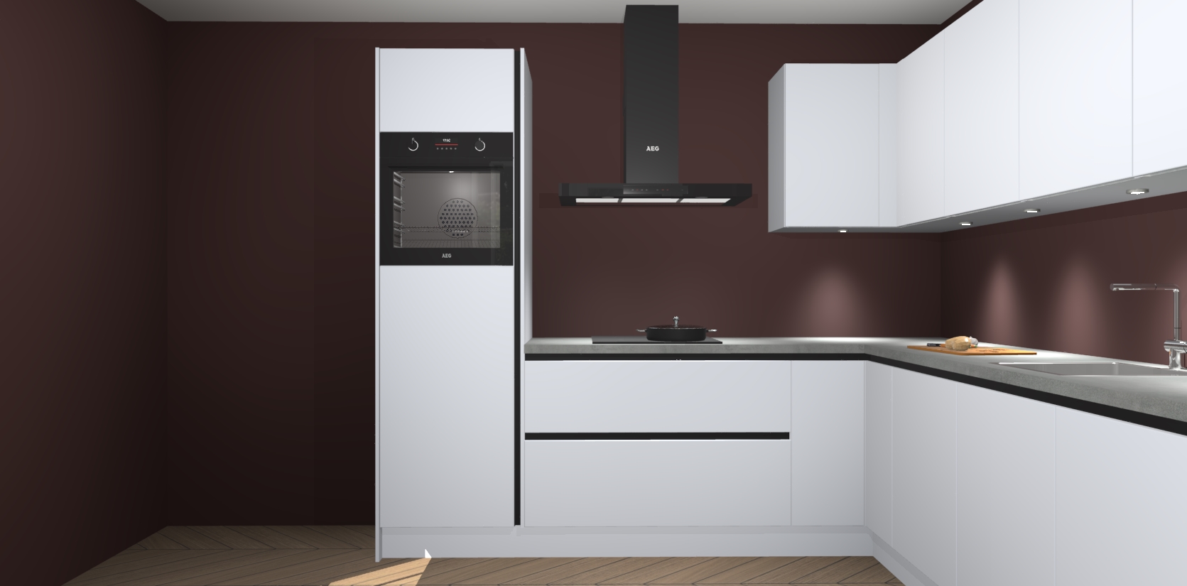 De Sneeuwwitte greeploze keuken Debar is uitgerust met vijf inbouwapparaten die elke kooktaak handig en efficiënt maken. Een oven, inductiekookplaat, afzuigkap, vaatwasser en koelkast zijn standaard, maar kunnen na bestelling eenvoudig worden geupgrade naar AEG. Profiteer vervolgens van de softclose deuren voor snelle toegang en geruisloze toegang.
