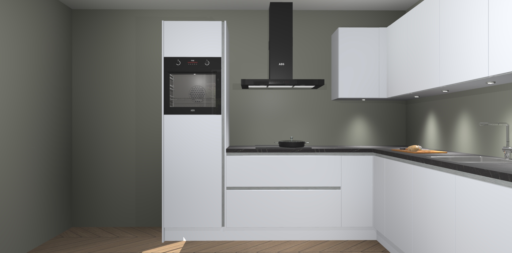 De Sneeuwwitte greeploze keuken Debar is uitgerust met vijf inbouwapparaten die elke kooktaak handig en efficiënt maken. Een oven, inductiekookplaat, afzuigkap, vaatwasser en koelkast zijn standaard, maar kunnen na bestelling eenvoudig worden geupgrade naar AEG. Profiteer vervolgens van de softclose deuren voor snelle toegang en geruisloze toegang.