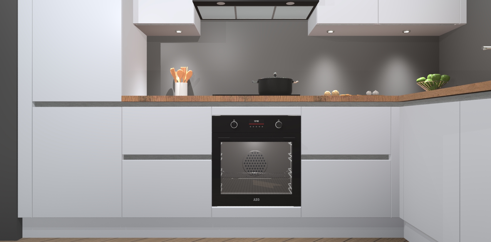 De Sneeuwwitte greeploze keuken Geneve is uitgerust met 5 inbouwapparaten - een oven, inductiekookplaat, afzuigkap, vaatwasser en koelkast - voor al uw kook- en bewaarbehoeftes. U kunt deze apparaten desgewenst eenvoudig upgraden naar AEG of de oven omruilen voor een combimagnetron na het plaatsen van uw bestelling. En met de soft close deuren, voldoende opbergruimte en kasten die voorgemonteerd worden geleverd, bent u in een mum van tijd klaar om heerlijke maaltijden te bereiden!