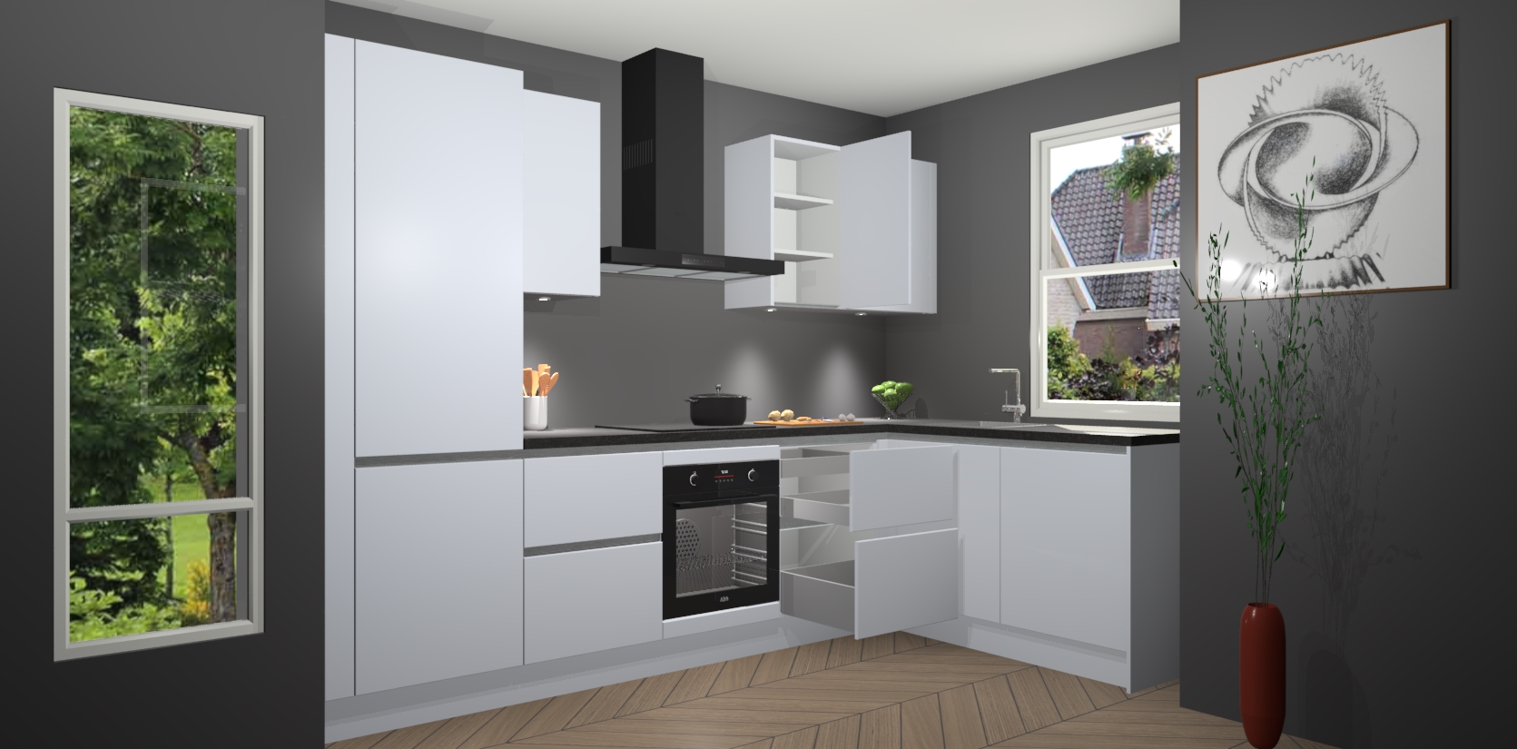 De Sneeuwwitte greeploze keuken Geneve is uitgerust met 5 inbouwapparaten - een oven, inductiekookplaat, afzuigkap, vaatwasser en koelkast - voor al uw kook- en bewaarbehoeftes. U kunt deze apparaten desgewenst eenvoudig upgraden naar AEG of de oven omruilen voor een combimagnetron na het plaatsen van uw bestelling. En met de soft close deuren, voldoende opbergruimte en kasten die voorgemonteerd worden geleverd, bent u in een mum van tijd klaar om heerlijke maaltijden te bereiden!