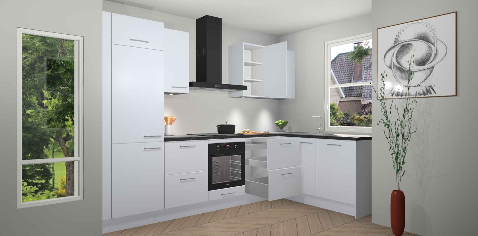 Bent u op zoek naar een moderne en tijdloze keuken die schoonheid in uw huis brengt? Zoek dan niet verder dan de Sneeuwwitte greeploze keuken Geneve - de perfecte keuken voor al uw wensen. Deze hoekkeuken biedt de hoogste Duitse kwaliteit voor een vaste lage prijs en is zeker een blikvanger in uw huis!