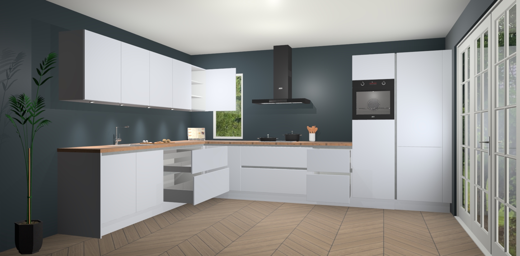 Heeft u nog apparatuur nodig? Geen probleem: de sneeuwwitte greeploze keuken Harare bevat vijf ingebouwde apparaten - een oven, inductiekookplaat, afzuigkap, vaatwasser en koelkast - die gemakkelijk kunnen worden bijgewerkt naar AEG na bestelling. En als dat nog niet genoeg is; onze kasten worden pre-geassembleerd geleverd en zijn verkrijgbaar tegen een vastgeroeste lage prijs! U hoeft nooit meer te zoeken naar goede kwaliteit en service want onze producten hebben echt Duitse kwaliteit.