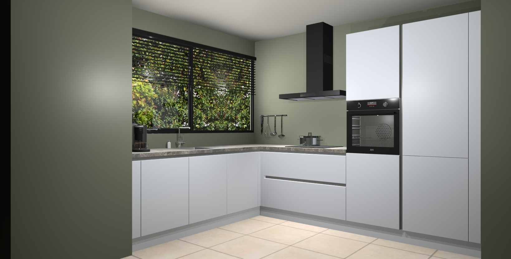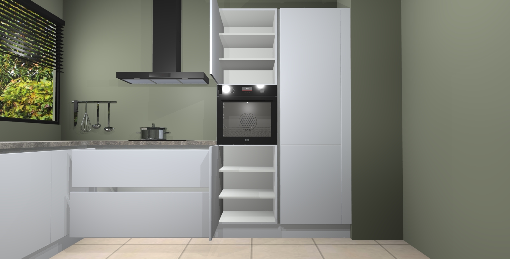 Met een modern, tijdloos design en ruime opslagruimte, zult u zich in no-time thuis voelen in uw nieuwe keuken. Uw leven wordt eenvoudiger met de soft-close deuren die voor het ultieme stille comfort zorgen - geen geluid dat u stoort terwijl u kookt. Ook is de keuken voorzien van 5 ingebouwde apparaten: een oven, inductie kookplaat, afzuigkap, vaatwasser en koelkast. Deze kunnen gemakkelijk na bestelling worden bijgewerkt naar AEG - waardoor uw luxe ervaring compleet is.