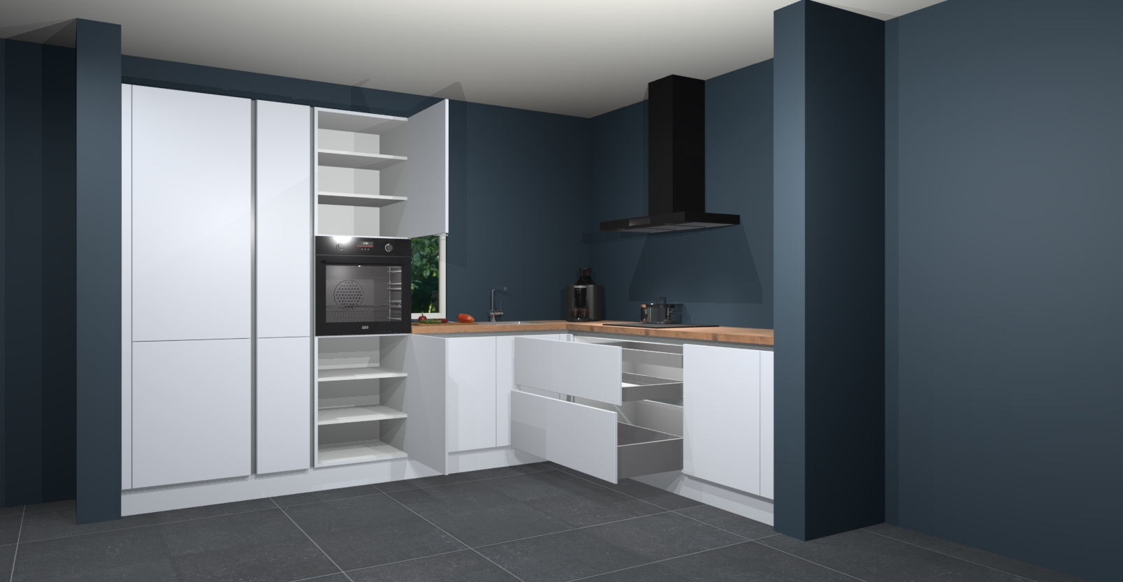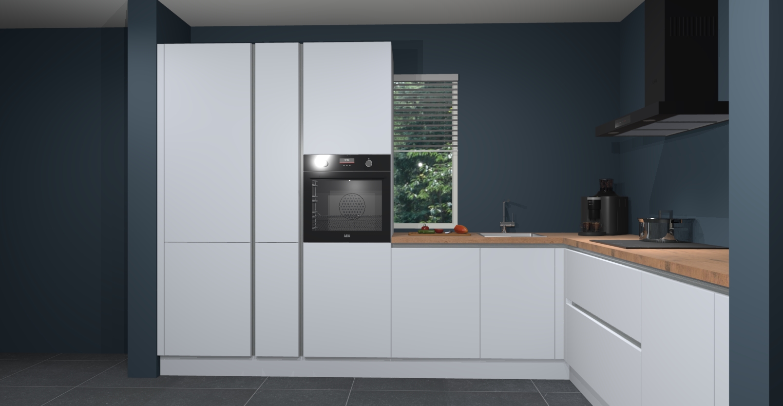Met een modern, tijdloos design en ruime opslagruimte, zult u zich in no-time thuis voelen in uw nieuwe keuken. Uw leven wordt eenvoudiger met de soft-close deuren die voor het ultieme stille comfort zorgen - geen geluid dat u stoort terwijl u kookt. Ook is de keuken voorzien van 5 ingebouwde apparaten: een oven, inductie kookplaat, afzuigkap, vaatwasser en koelkast. Deze kunnen gemakkelijk na bestelling worden bijgewerkt naar AEG - waardoor uw luxe ervaring compleet is.