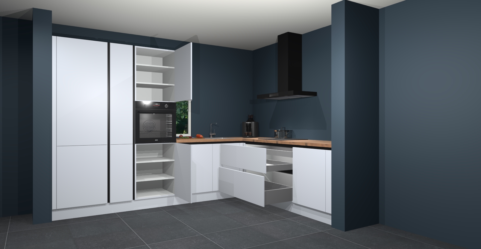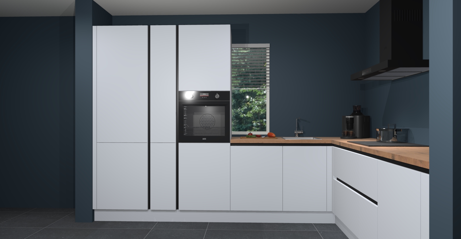 Met een modern, tijdloos design en ruime opslagruimte, zult u zich in no-time thuis voelen in uw nieuwe keuken. Uw leven wordt eenvoudiger met de soft-close deuren die voor het ultieme stille comfort zorgen - geen geluid dat u stoort terwijl u kookt. Ook is de keuken voorzien van 5 ingebouwde apparaten: een oven, inductie kookplaat, afzuigkap, vaatwasser en koelkast. Deze kunnen gemakkelijk na bestelling worden bijgewerkt naar AEG - waardoor uw luxe ervaring compleet is.