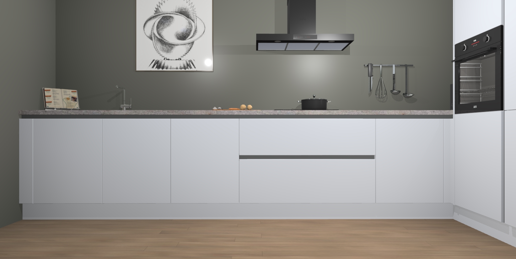 Welkom bij de Sneeuwwitte greeploze keuken Khao Lak. Deze prachtige keuken zal de komende jaren het middelpunt van de belangstelling in uw huis zijn. Uitgerust met vijf inbouwapparaten komt u nooit kookgereedschap tekort. Bovendien geeft de warme houtlook elke ruimte een uitnodigende en tijdloze uitstraling.