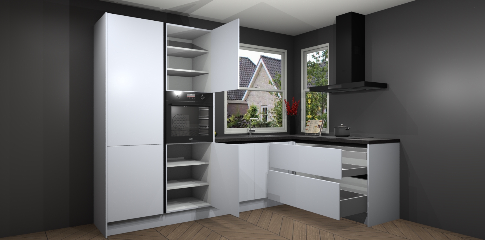 De Sneeuwwitte greeploze keuken Kotor wordt geleverd met vijf inbouwapparaten, waaronder een oven, inductiekookplaat, afzuigkap, vaatwasser en koelkast. En als u uw apparatuur wilt upgraden, kunnen we u na bestelling eenvoudig helpen overstappen naar AEG. Bovendien heeft deze keuken soft close deuren, zodat lades en kastjes geruisloos en zonder klepperen sluiten!