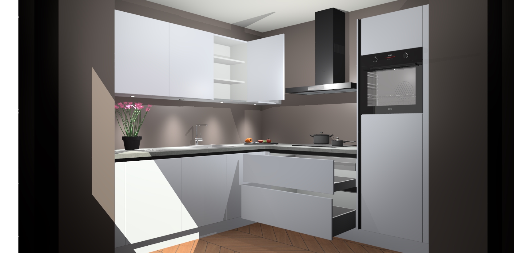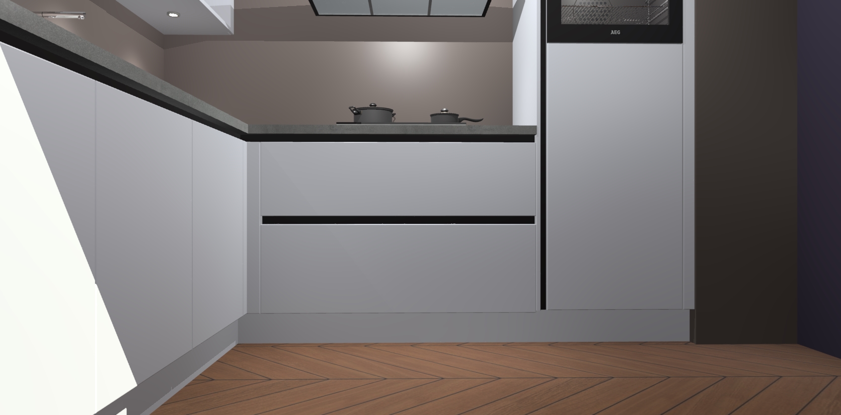Met een modern, tijdloos design en ruime opslagruimte, zult u zich in no-time thuis voelen in uw nieuwe keuken. Uw leven wordt eenvoudiger met de soft-close deuren die voor het ultieme stille comfort zorgen - geen geluid dat u stoort terwijl u kookt. Ook is de keuken voorzien van 5 ingebouwde apparaten: een oven, inductie kookplaat, afzuigkap, vaatwasser en koelkast. Deze kunnen gemakkelijk na bestelling worden bijgewerkt naar AEG - waardoor uw luxe ervaring compleet is.