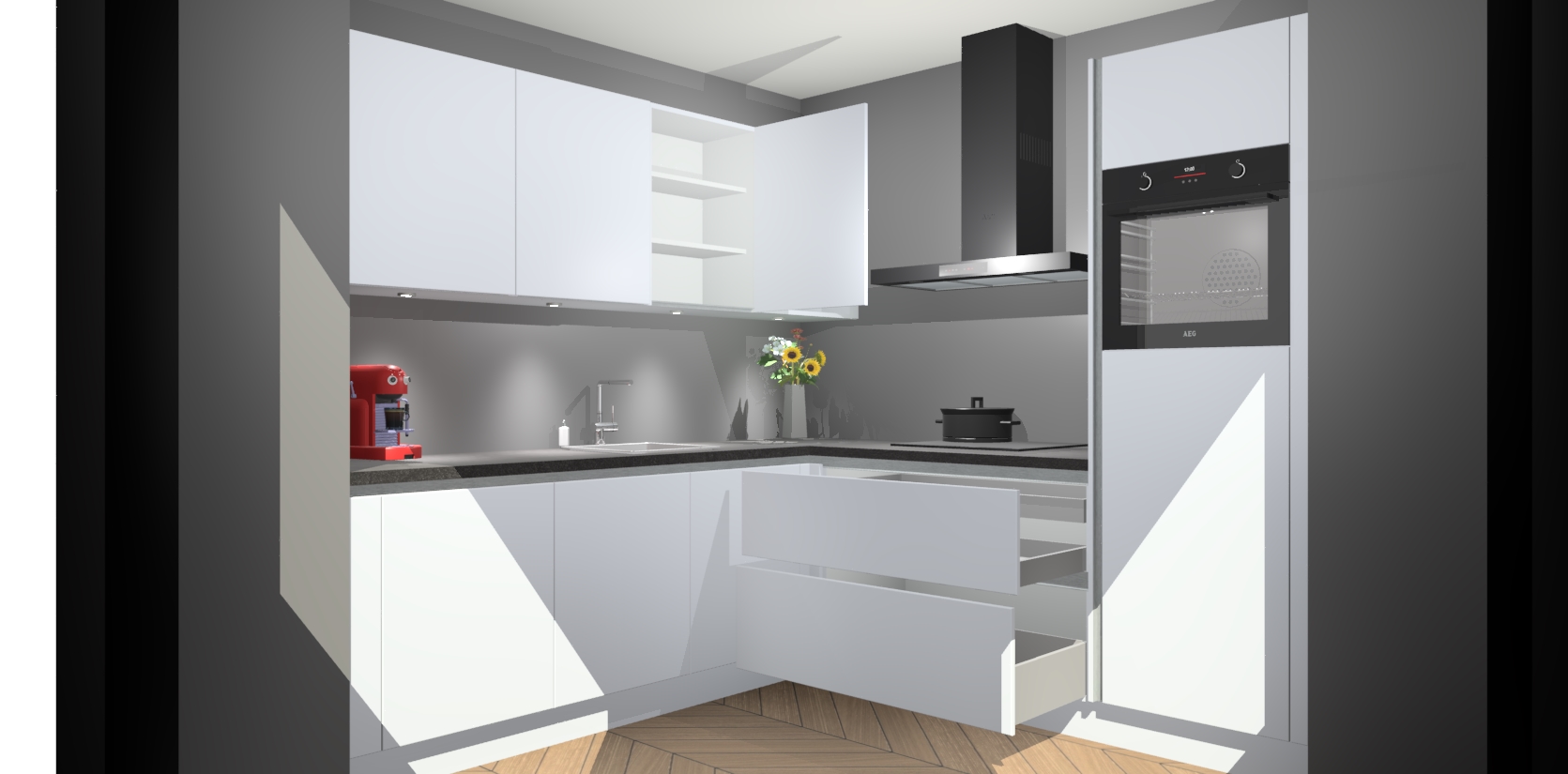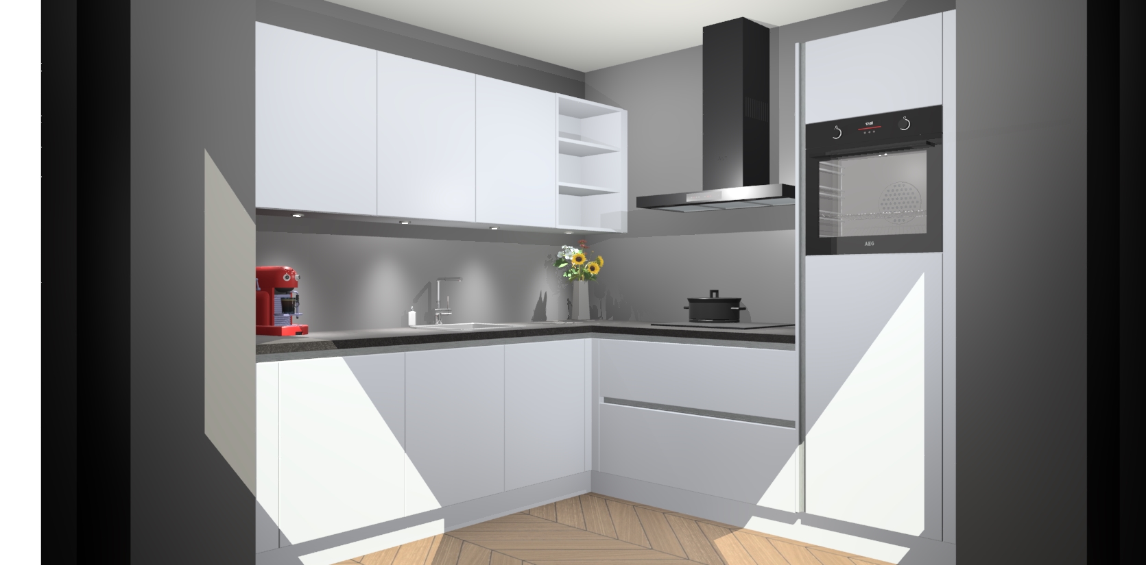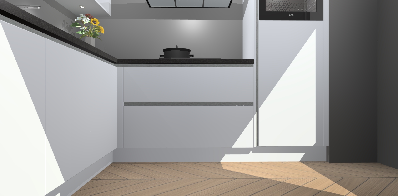 Met een modern, tijdloos design en ruime opslagruimte, zult u zich in no-time thuis voelen in uw nieuwe keuken. Uw leven wordt eenvoudiger met de soft-close deuren die voor het ultieme stille comfort zorgen - geen geluid dat u stoort terwijl u kookt. Ook is de keuken voorzien van 5 ingebouwde apparaten: een oven, inductie kookplaat, afzuigkap, vaatwasser en koelkast. Deze kunnen gemakkelijk na bestelling worden bijgewerkt naar AEG - waardoor uw luxe ervaring compleet is.