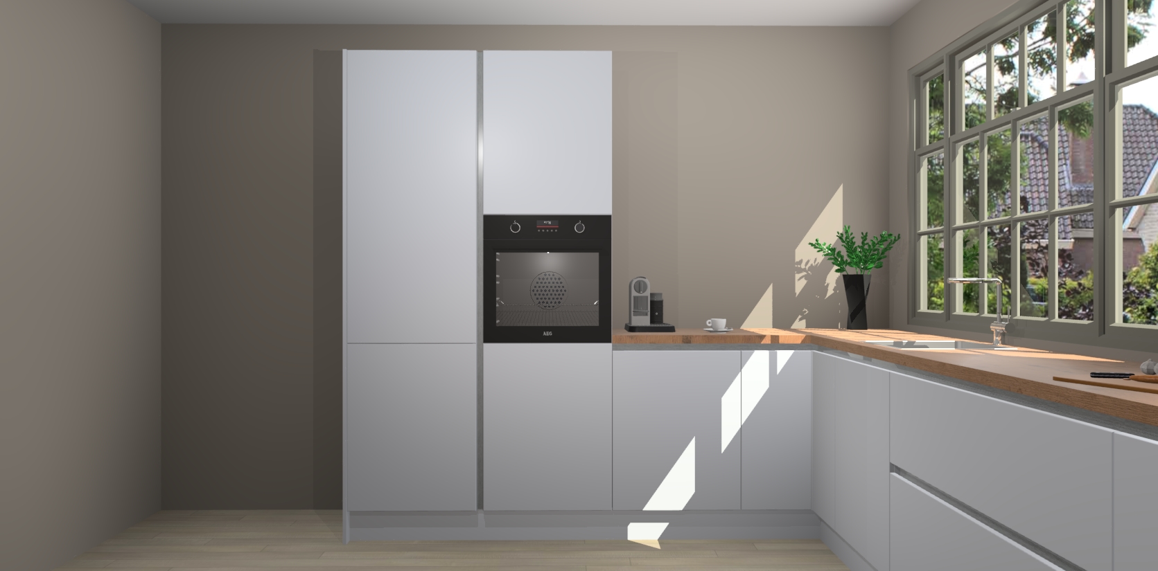 Kom dichtbij de perfecte keuken van uw dromen met de sneeuwwitte greeploze keuken Malaga. Met een prachtige houtlook en eigentijds ontwerp, straalt deze keuken warmte en sfeer uit. Of u nu liefhebber bent van traditionele of moderne stijlen, er is genoeg ruimte om aan al uw behoeften te voldoen.