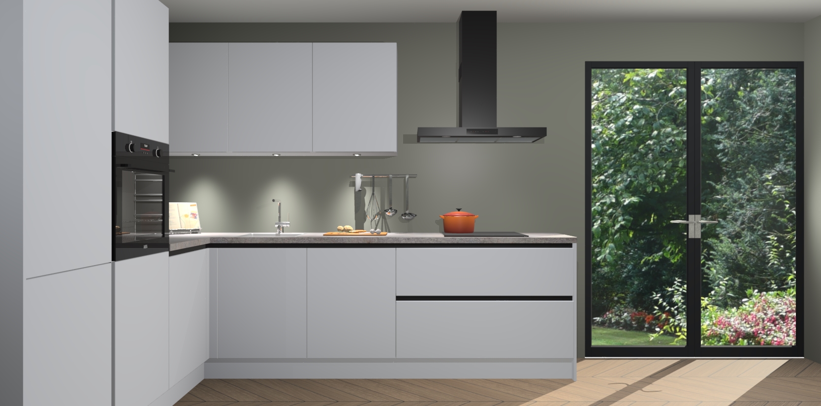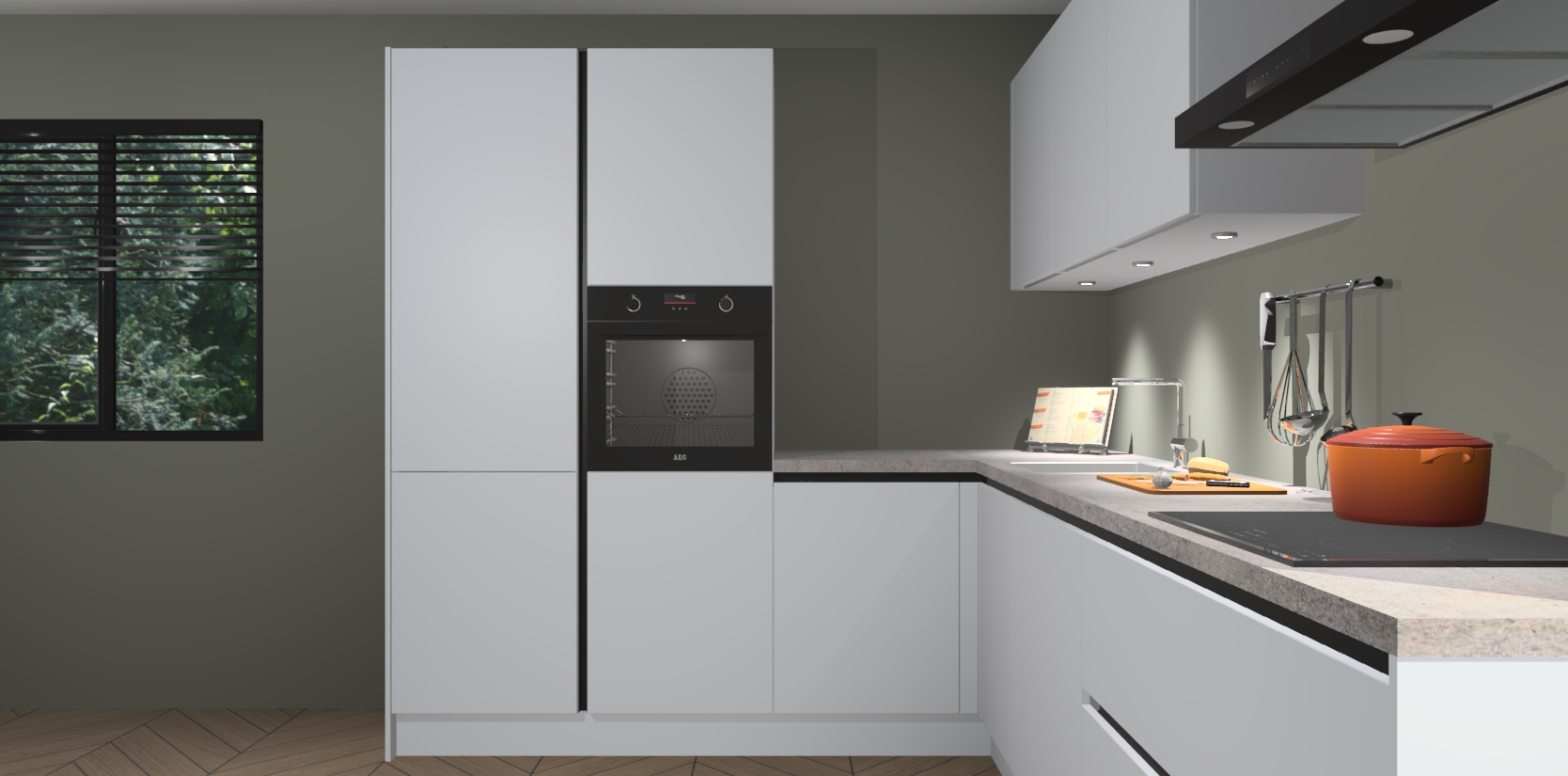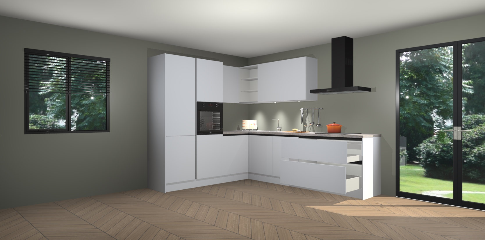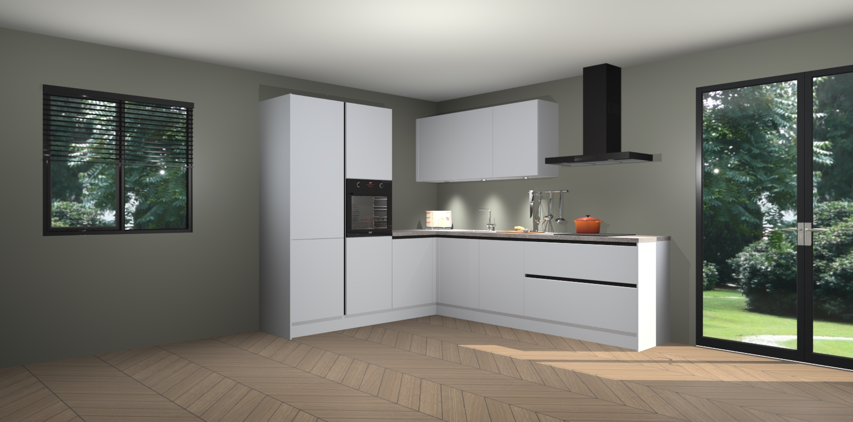 Maak kennis met de sneeuwwitte greeploze keuken Parla - de perfecte aanvulling voor uw moderne keuken! Ervaar tijdloos design, elegantie en een chique uitstraling met onze zwarte handgrepen, soft-close deuren en veel opbergruimte. Dit alles wordt aangeboden tegen een vaste lage prijs voor ongeëvenaarde Duitse keukenkwaliteit!