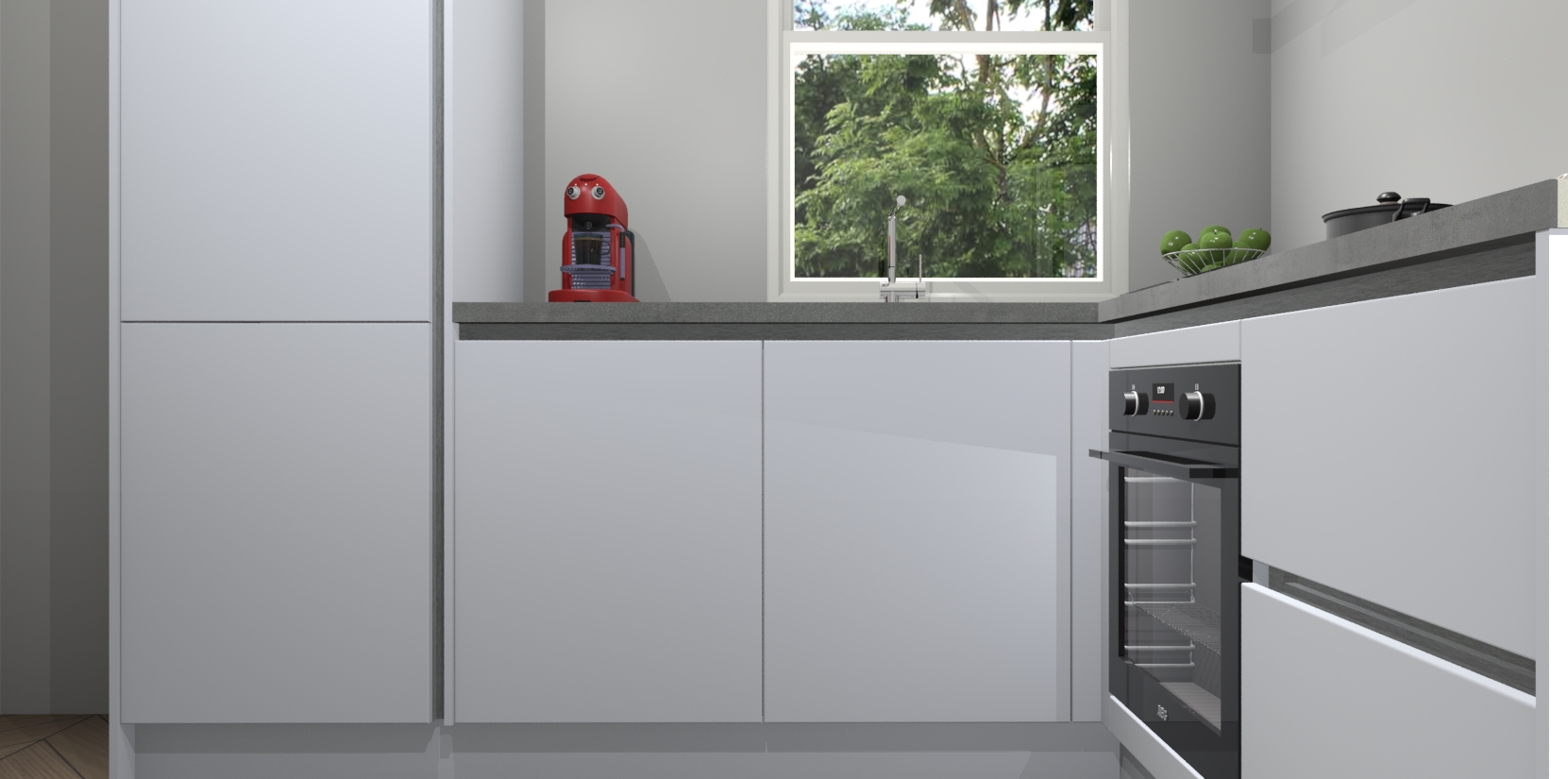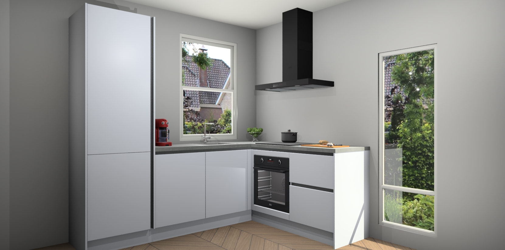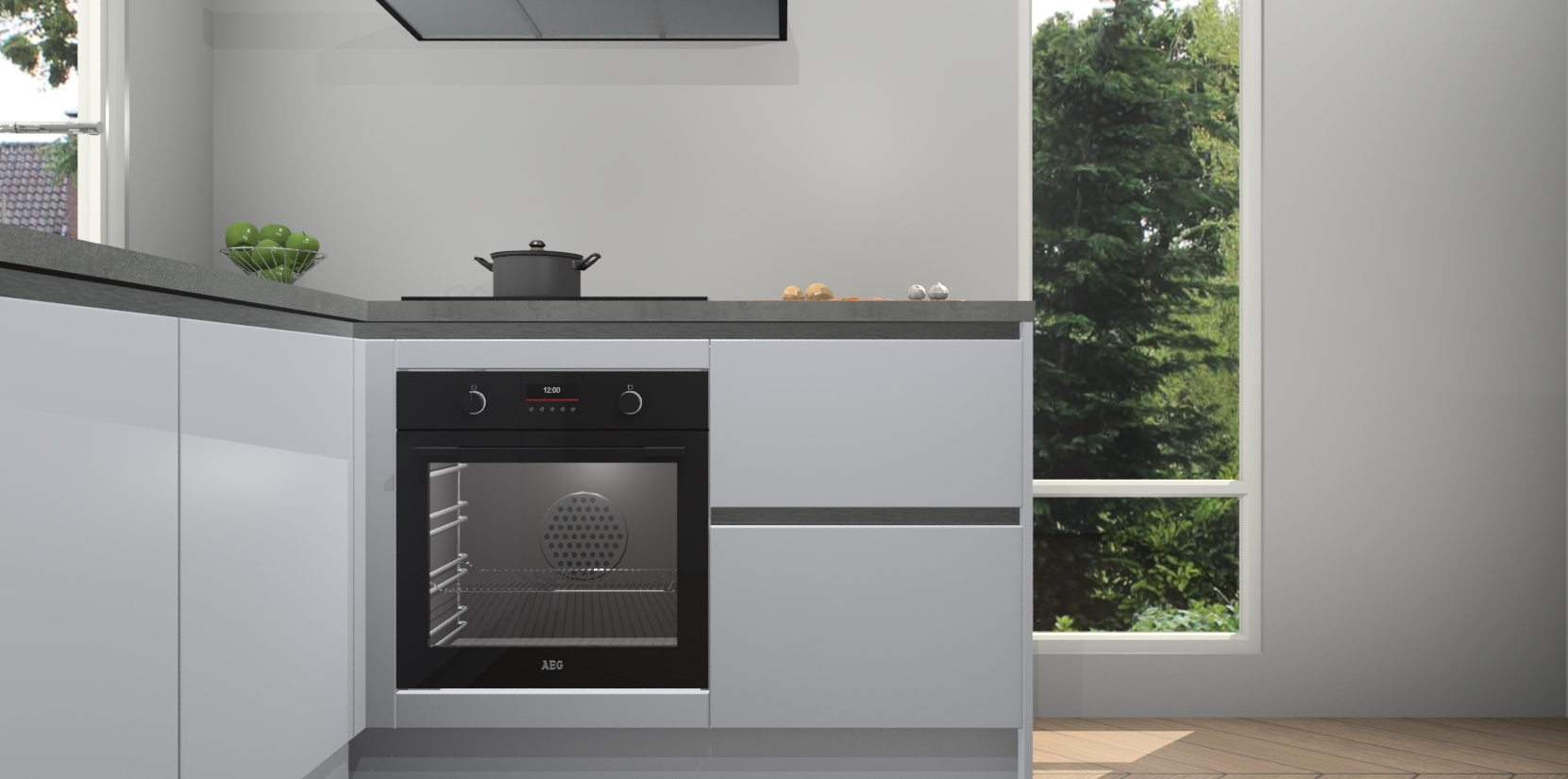De Sneeuwwitte greeploze keuken Phuket heeft alles wat u maar kunt wensen. Niet alleen zijn er softclose deuren, maar ook 5 ingebouwde apparaten: een oven, inductiekookplaat, afzuigkap, vaatwasser en koelkast - waarbij u later gemakkelijk naar het AEG merk, van inductiekookplaat naar kookplaat met geïntegreerde afzuiging of van oven naar combimagnetron kunt upgraden. Dat alles tegen een vast laag tarief! Bovendien geeft de Sneeuwwitte greeploze keuken Phuket supersnelle levering van 7 weken. Echt iets voor u als u er niet op wilt wachten om het resultaat te zien in eigen keuken!