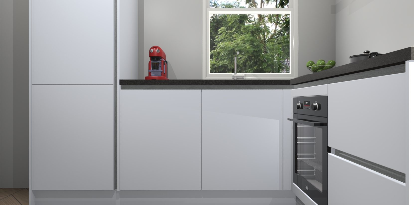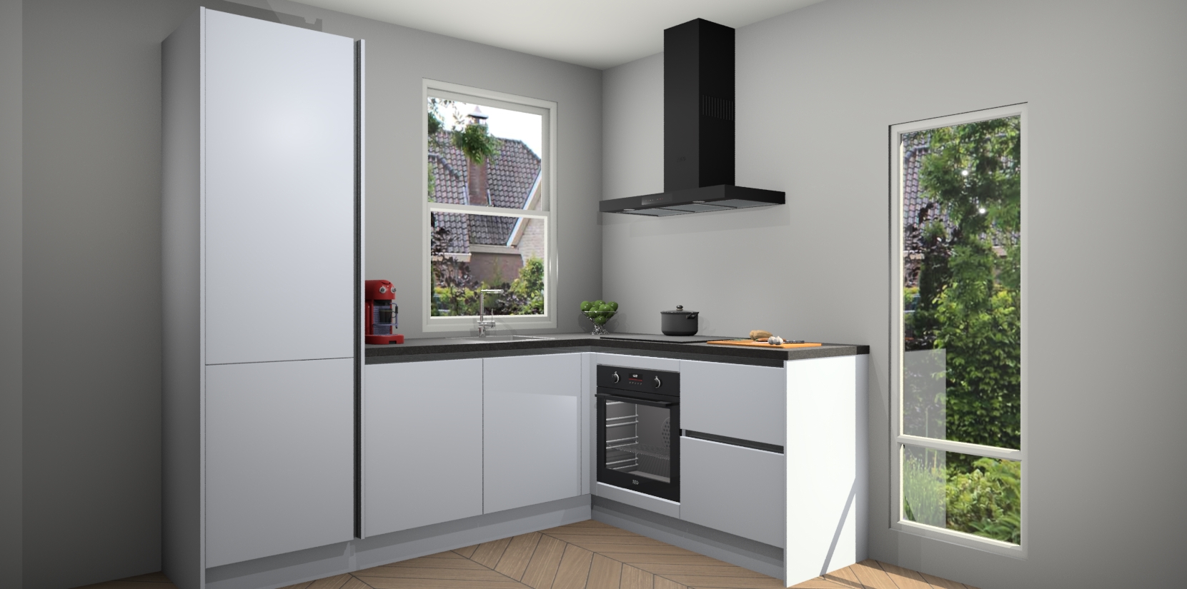De Sneeuwwitte greeploze keuken Phuket heeft alles wat u maar kunt wensen. Niet alleen zijn er softclose deuren, maar ook 5 ingebouwde apparaten: een oven, inductiekookplaat, afzuigkap, vaatwasser en koelkast - waarbij u later gemakkelijk naar het AEG merk, van inductiekookplaat naar kookplaat met geïntegreerde afzuiging of van oven naar combimagnetron kunt upgraden. Dat alles tegen een vast laag tarief! Bovendien geeft de Sneeuwwitte greeploze keuken Phuket supersnelle levering van 7 weken. Echt iets voor u als u er niet op wilt wachten om het resultaat te zien in eigen keuken!