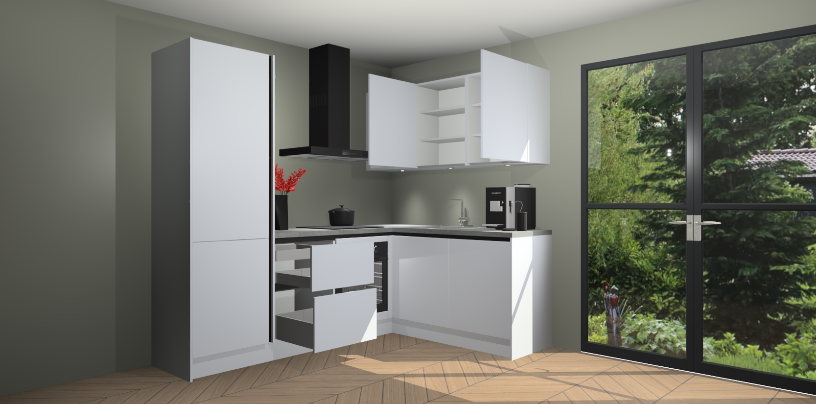 Wauw, dit is de Sneeuwwitte greeploze keuken Pilsen! U kunt gerust zeggen dat u elegantie combineert met functionaliteit met deze keuken. Met een modern en chique ontwerp is de keuken precies wat u nodig heeft om uw ruimte te verfraaien. De binnenzijde van de kasten is in dezelfde donkere kleur als de buitenzijde voor een uniforme look, compleet met softclose-kasten die stil sluiten.