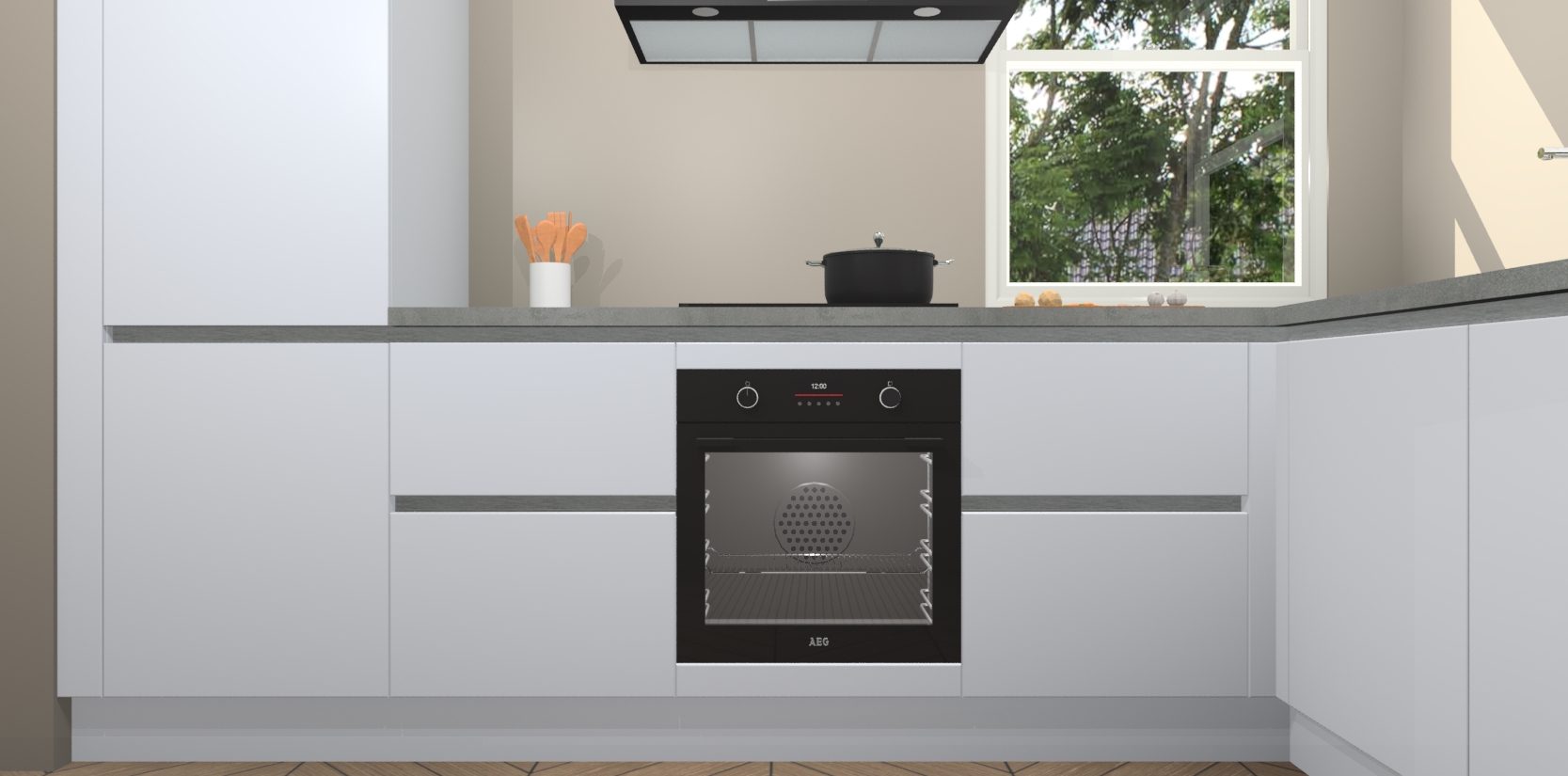 Wat maakt deze keuken zo bijzonder? Ten eerste geeft het houten werkblad uw ruimte een onmiskenbaar klassieke uitstraling. De natuurlijke afwerking roept warmte en elegantie op die nooit uit de mode zullen raken. Bovendien is het gemakkelijk schoon te houden en te onderhouden, zodat je er jarenlang plezier van kunt hebben. Als u op zoek bent naar extra gemak in uw keuken, dan heeft u bij het plaatsen van een bestelling bij ons ook de optie om uw toestellen te upgraden naar AEG-modellen - zo haalt u moderne innovatie van topmerken in apparatentechnologie rechtstreeks in huis.