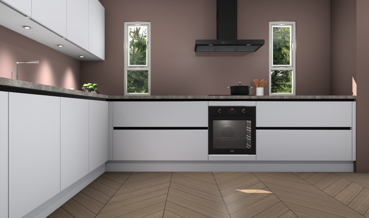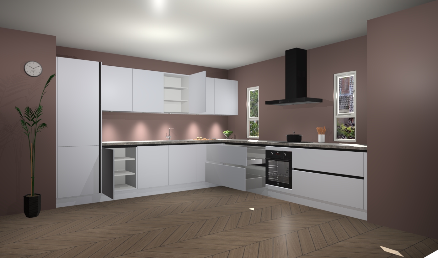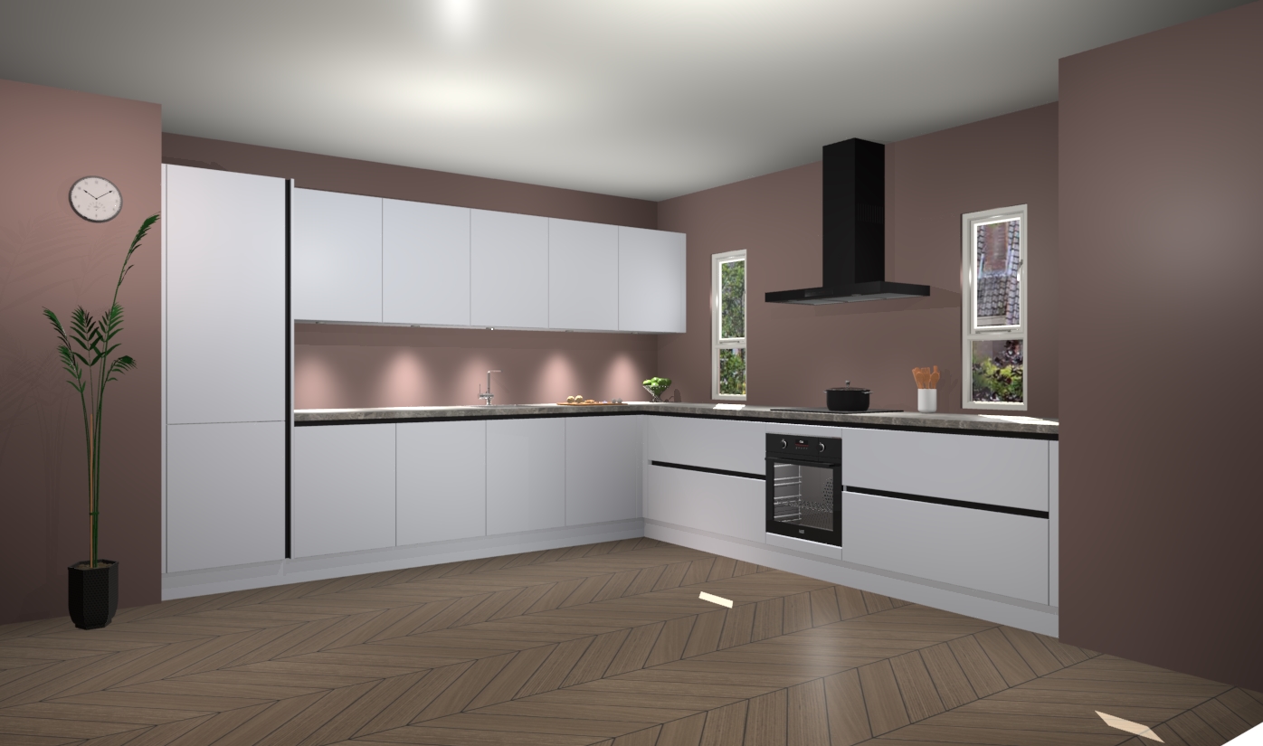 De sneeuwwite greeploze keuken is een ideale hoekkeuken en heeft alle functies en apparatuur die u maar nodig kunt hebben. Bij de bestelling krijgt u een oven, inductiekookplaat, afzuigkap, vaatwasser en koelkast - deze kunnen desgewenst eenvoudig worden uitgebreid naar AEG na bestellen. Elke kast wordt ook voor gemonteerd geleverd met soft close deuren die jarenlang gebruik beloven. Stelt u zich voor dat u geen gedoe heeft met vervelende montage - vanaf het moment dat u uw bestelling plaats, duurt het slechts 7 weken voor het bij u thuis geleverd wordt.