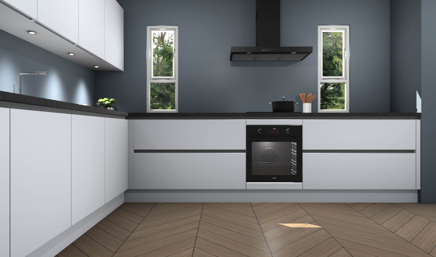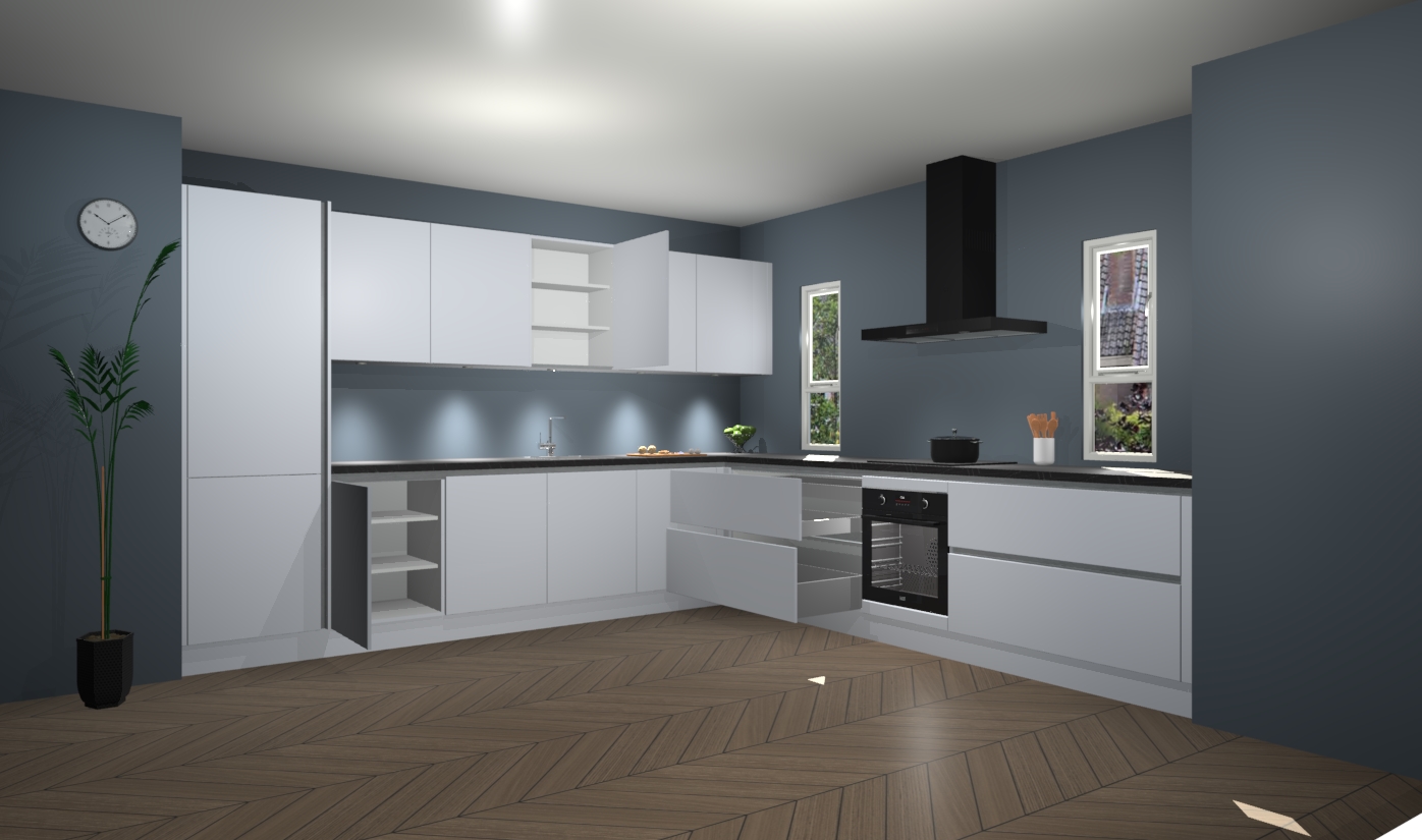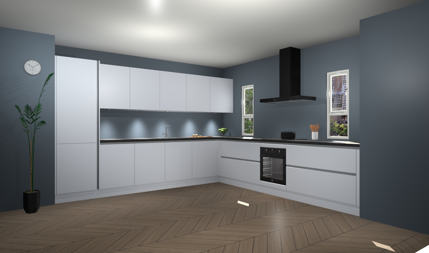 De sneeuwwite greeploze keuken is een ideale hoekkeuken en heeft alle functies en apparatuur die u maar nodig kunt hebben. Bij de bestelling krijgt u een oven, inductiekookplaat, afzuigkap, vaatwasser en koelkast - deze kunnen desgewenst eenvoudig worden uitgebreid naar AEG na bestellen. Elke kast wordt ook voor gemonteerd geleverd met soft close deuren die jarenlang gebruik beloven. Stelt u zich voor dat u geen gedoe heeft met vervelende montage - vanaf het moment dat u uw bestelling plaats, duurt het slechts 7 weken voor het bij u thuis geleverd wordt.