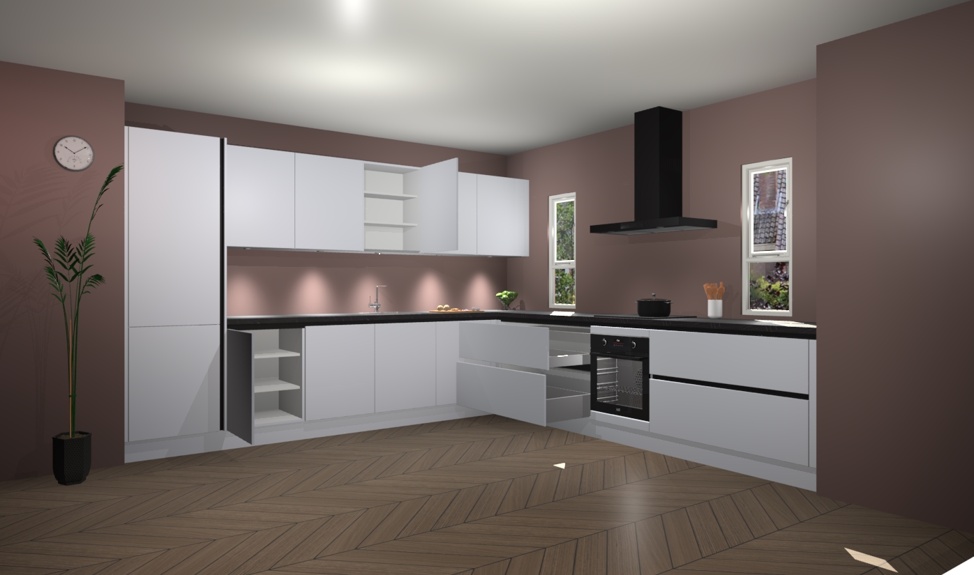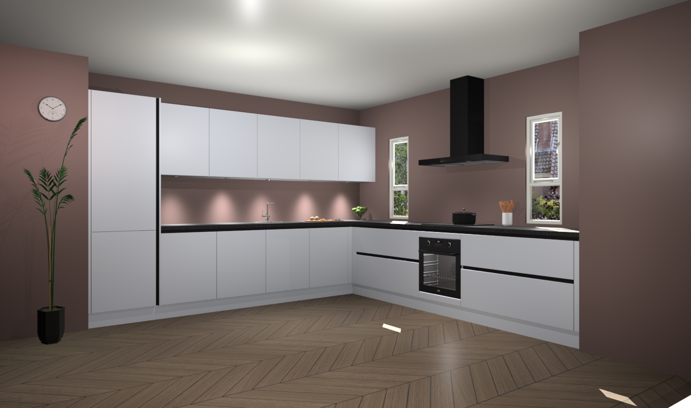 De sneeuwwite greeploze keuken is een ideale hoekkeuken en heeft alle functies en apparatuur die u maar nodig kunt hebben. Bij de bestelling krijgt u een oven, inductiekookplaat, afzuigkap, vaatwasser en koelkast - deze kunnen desgewenst eenvoudig worden uitgebreid naar AEG na bestellen. Elke kast wordt ook voor gemonteerd geleverd met soft close deuren die jarenlang gebruik beloven. Stelt u zich voor dat u geen gedoe heeft met vervelende montage - vanaf het moment dat u uw bestelling plaats, duurt het slechts 7 weken voor het bij u thuis geleverd wordt.