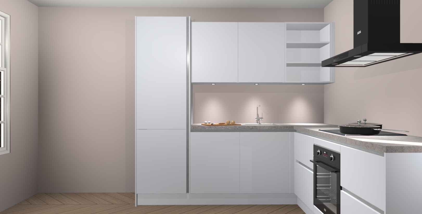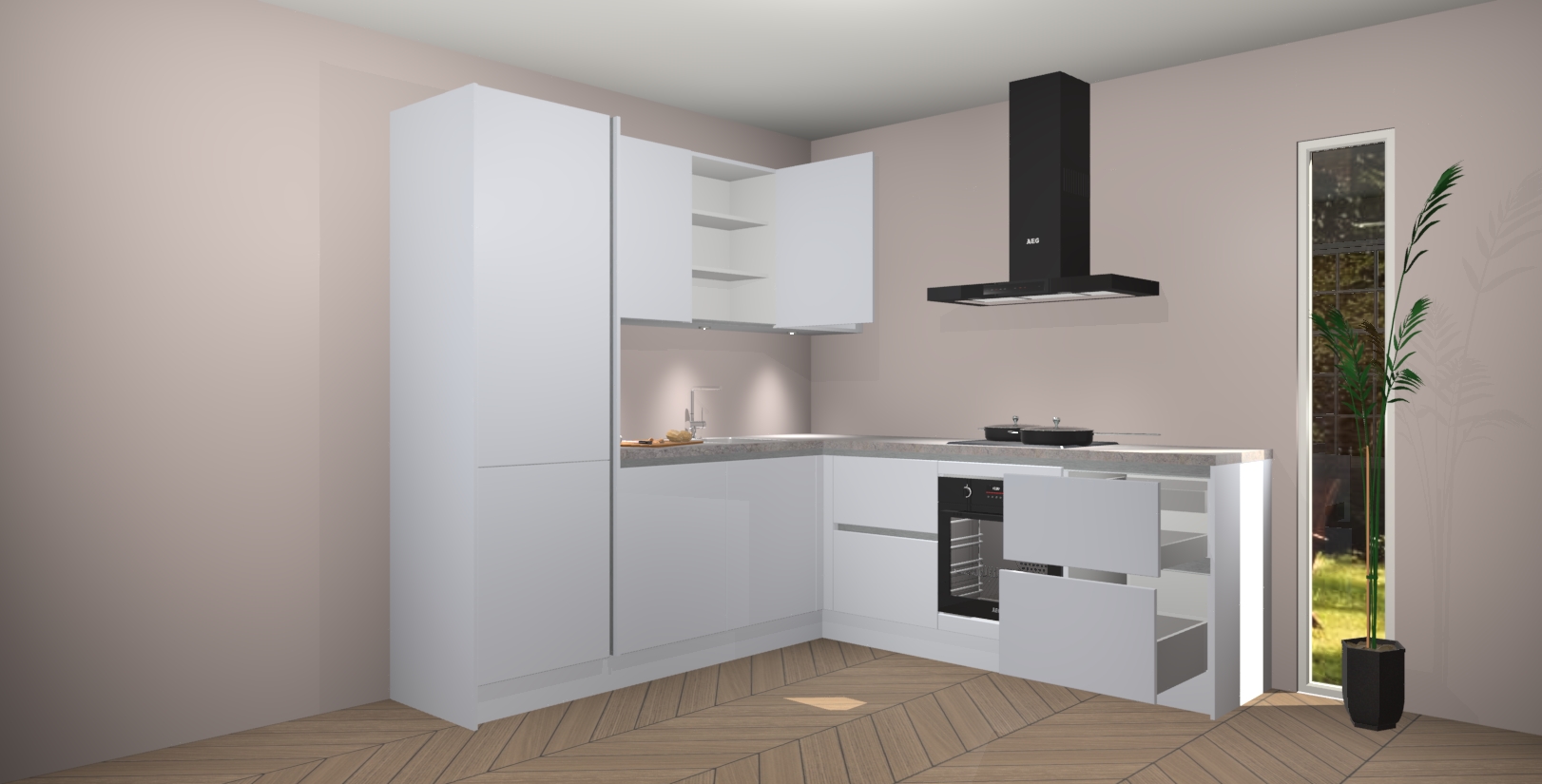 Met zijn moderne design en aantrekkelijke hoekopstelling biedt deze keuken een unieke look die zelfs de meest veeleisende huiseigenaar zal bevallen. En omdat de binnenkant van de kasten dezelfde kleur heeft als de buitenkant, heeft uw keuken een consistente afwerking. Bovenop de geweldige look is opbergruimte ook geen probleem, met voldoende kast- en laderuimte achter zelfs de mooiste buitenkant.
