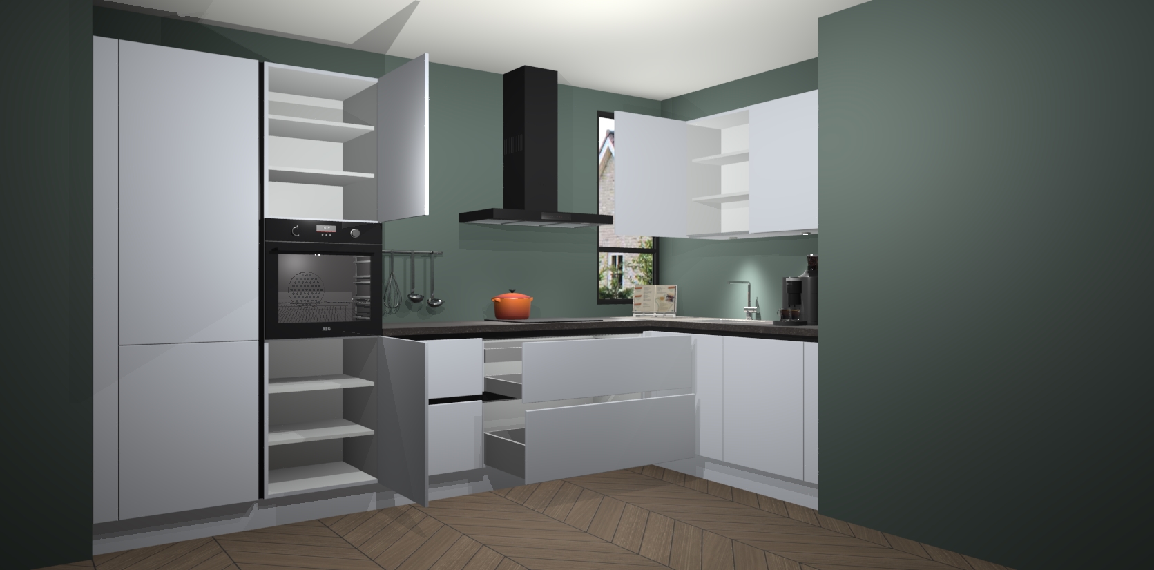 Welkom in uw nieuwe moderne keuken! Laat ons u voorstellen aan de Sneeuwwitte greeploze keuken Vlaanderen . Deze prachtige hoekkeuken straalt exclusiviteit en luxe uit als geen ander. Het strakke design, de tijdloze kleuren en het greeploze model maken van deze keuken een moderne klassieker. En met voldoende opbergruimte heeft deze keuken echt voor ieder wat wils.