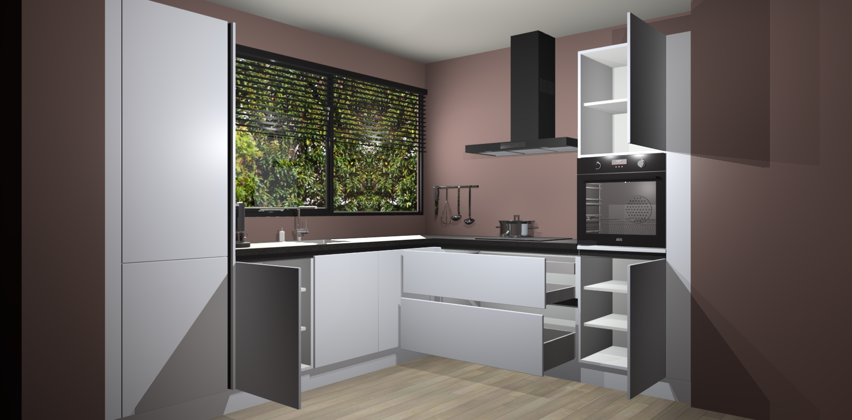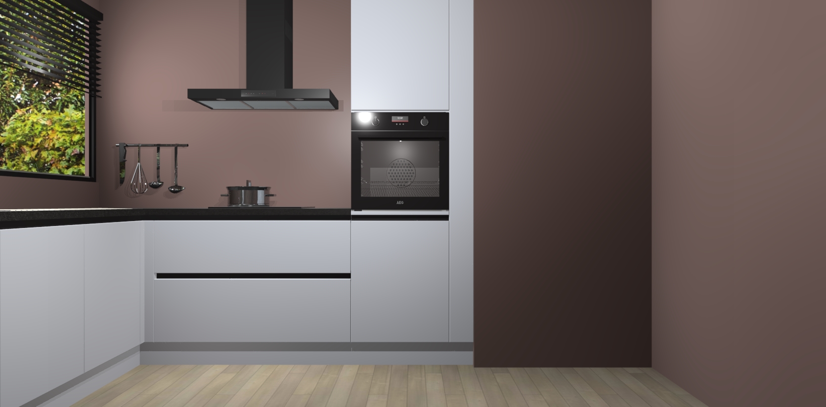 Met een modern, tijdloos design en ruime opslagruimte, zult u zich in no-time thuis voelen in uw nieuwe keuken. Uw leven wordt eenvoudiger met de soft-close deuren die voor het ultieme stille comfort zorgen - geen geluid dat u stoort terwijl u kookt. Ook is de keuken voorzien van 5 ingebouwde apparaten: een oven, inductie kookplaat, afzuigkap, vaatwasser en koelkast. Deze kunnen gemakkelijk na bestelling worden bijgewerkt naar AEG - waardoor uw luxe ervaring compleet is.