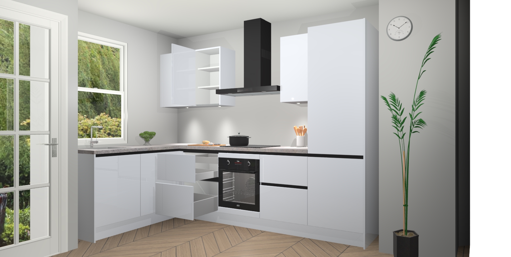 U hoeft zich ook geen zorgen te maken over een gebrek aan opbergruimte, want deze keuken heeft voldoende opbergmogelijkheden zowel boven als onder het aanrecht. Om het leven nog makkelijker te maken, wordt deze moderne hoekkeuken geleverd met 5 ingebouwde apparaten, waaronder een oven, inductiekookplaat, afzuigkap, vaatwasser en koelkast, zodat u in een mum van tijd klaar bent voor actie!