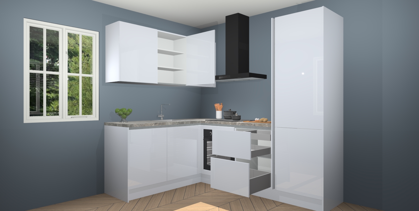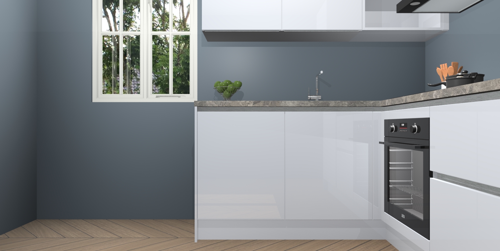 Voor nog meer gemak heeft deze keuken vijf ingebouwde apparaten - oven, inductiekookplaat, afzuigkap, vaatwasser en koelkast. Bovendien hebben alle kasten softclose deuren voor extra comfort bij het sluiten. Dit alles voor een verrassend lage vaste prijs - u vindt nergens anders een betere deal!