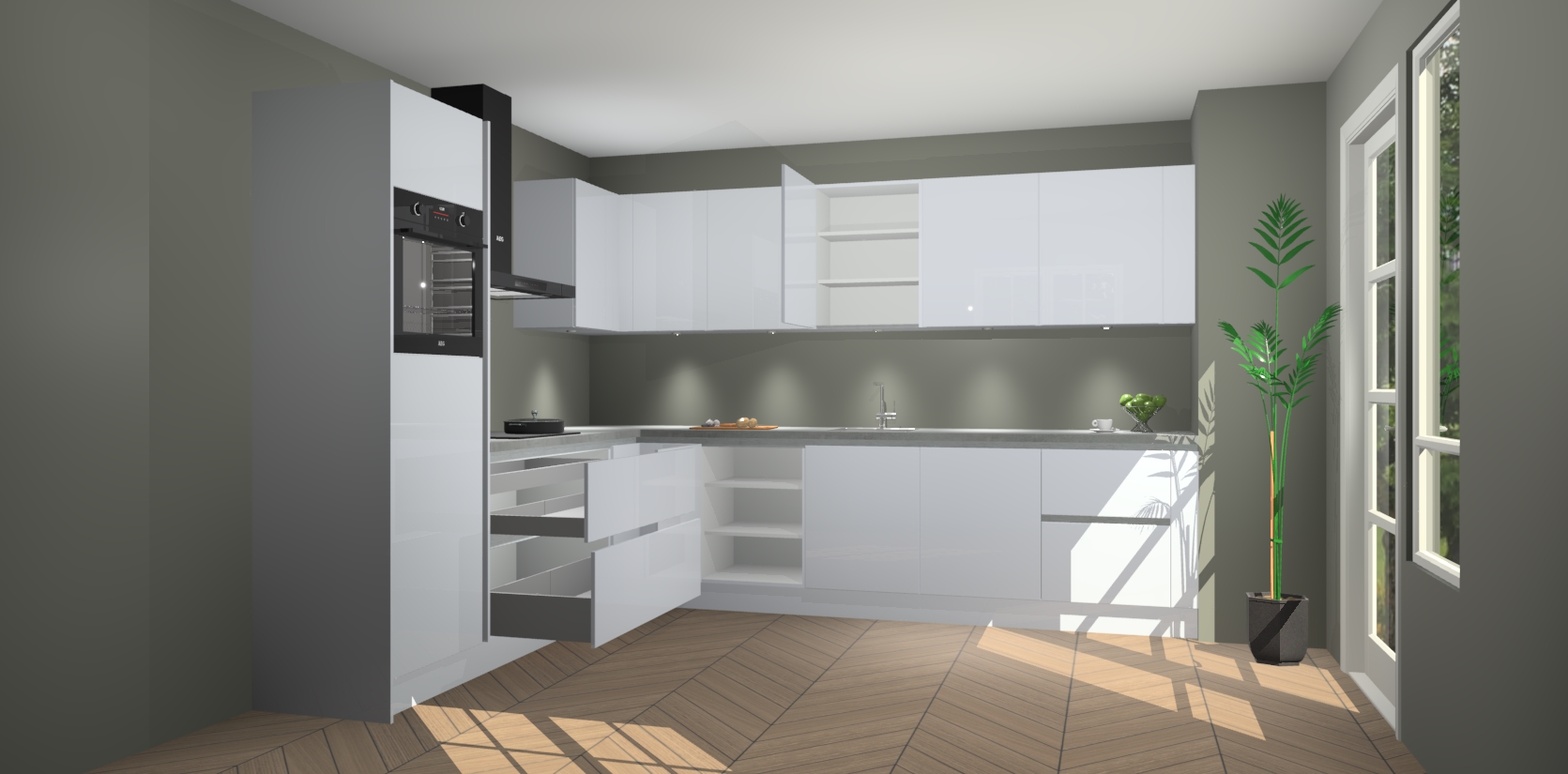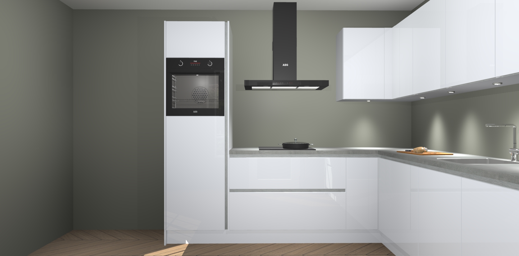 De Sneeuwwitte hoogglans greeploze keuken Debar is uitgerust met vijf inbouwapparaten die elke kooktaak handig en efficiënt maken. Een oven, inductiekookplaat, afzuigkap, vaatwasser en koelkast zijn standaard, maar kunnen na bestelling eenvoudig worden geupgrade naar AEG. Profiteer vervolgens van de softclose deuren voor snelle toegang en geruisloze toegang.